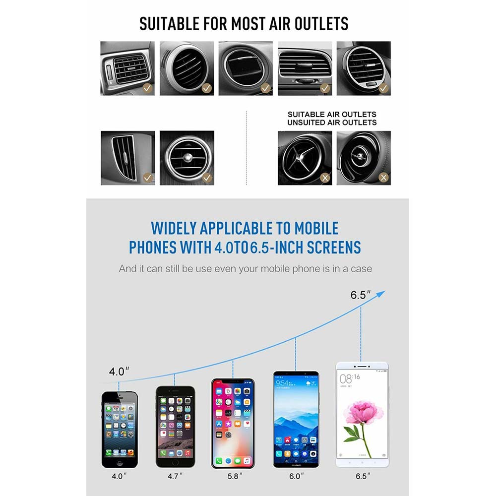 - Compared with windshield or dashboard mount, the air vent mount is much easier for you to contact the phone in car and causes less distraction while driving.