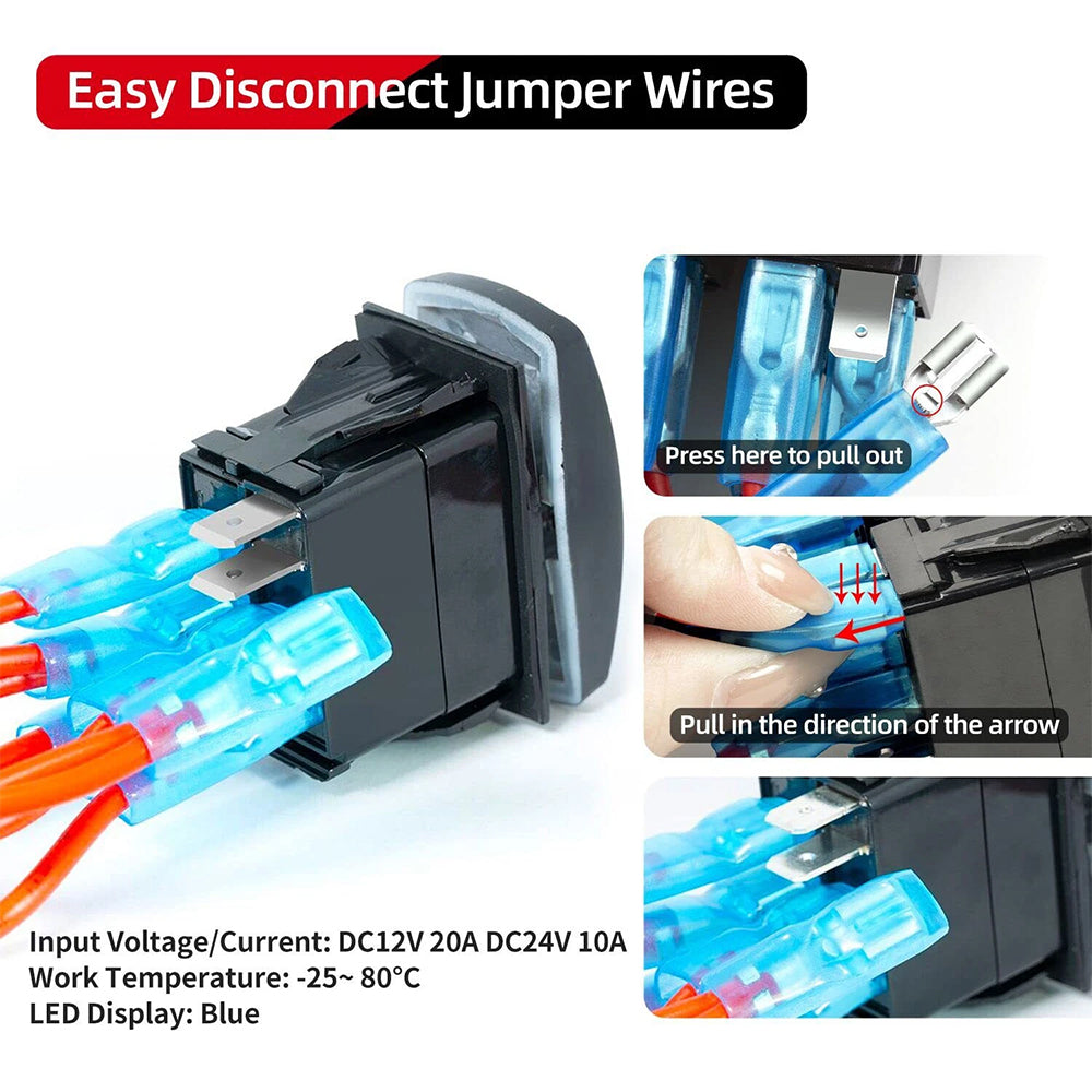 ④LED illuminated marine grade rocker switches, presented with vehicle and marine labels, easy for DIY.