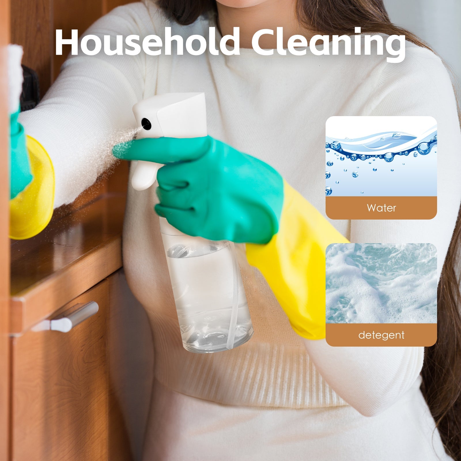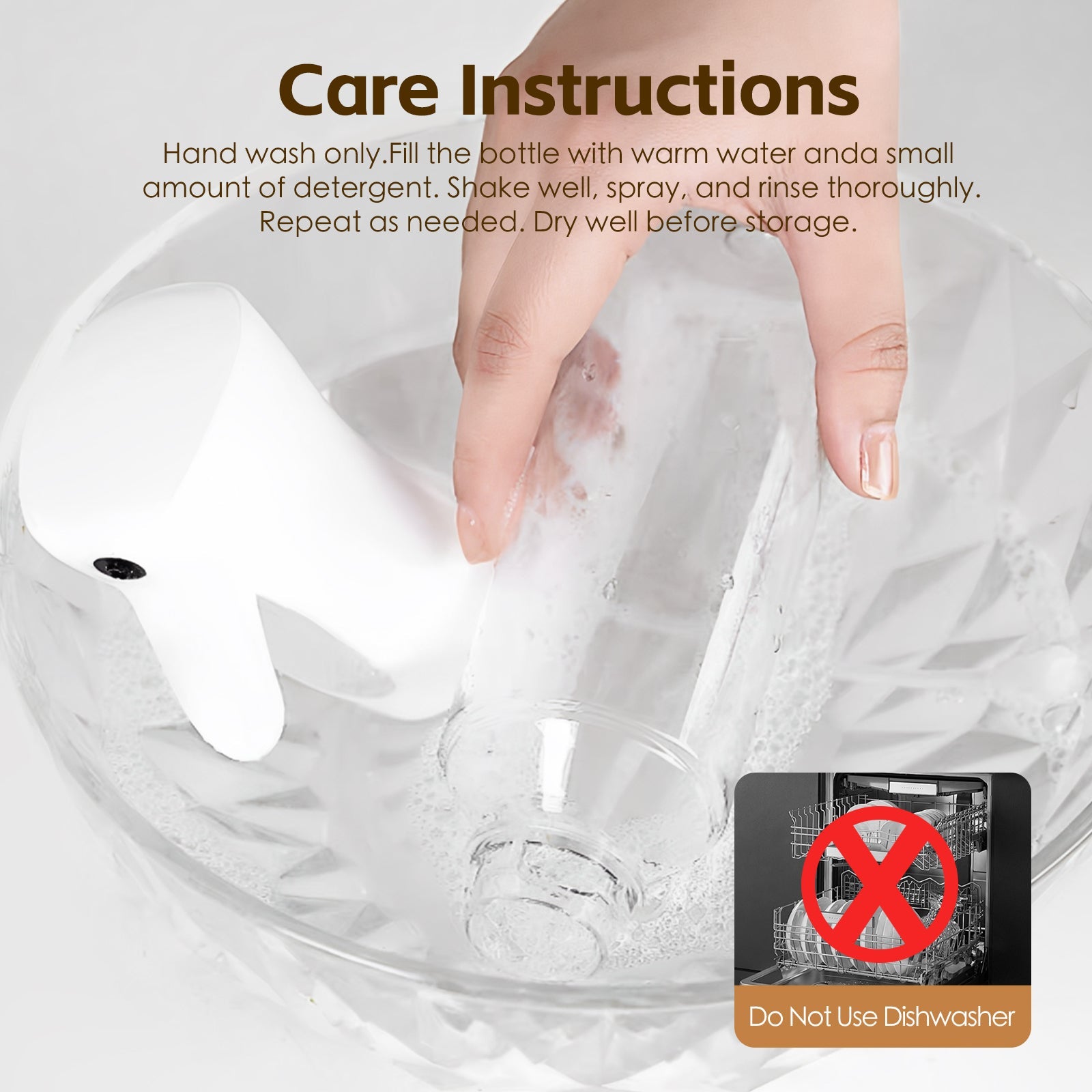 Hand wash only.Fill the bottle with warm water anda small amount of detergent. Shake well, spray, and rinse thoroughly.Repeat as needed. Dry well before storage.