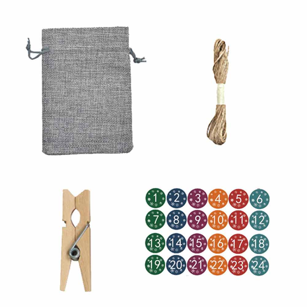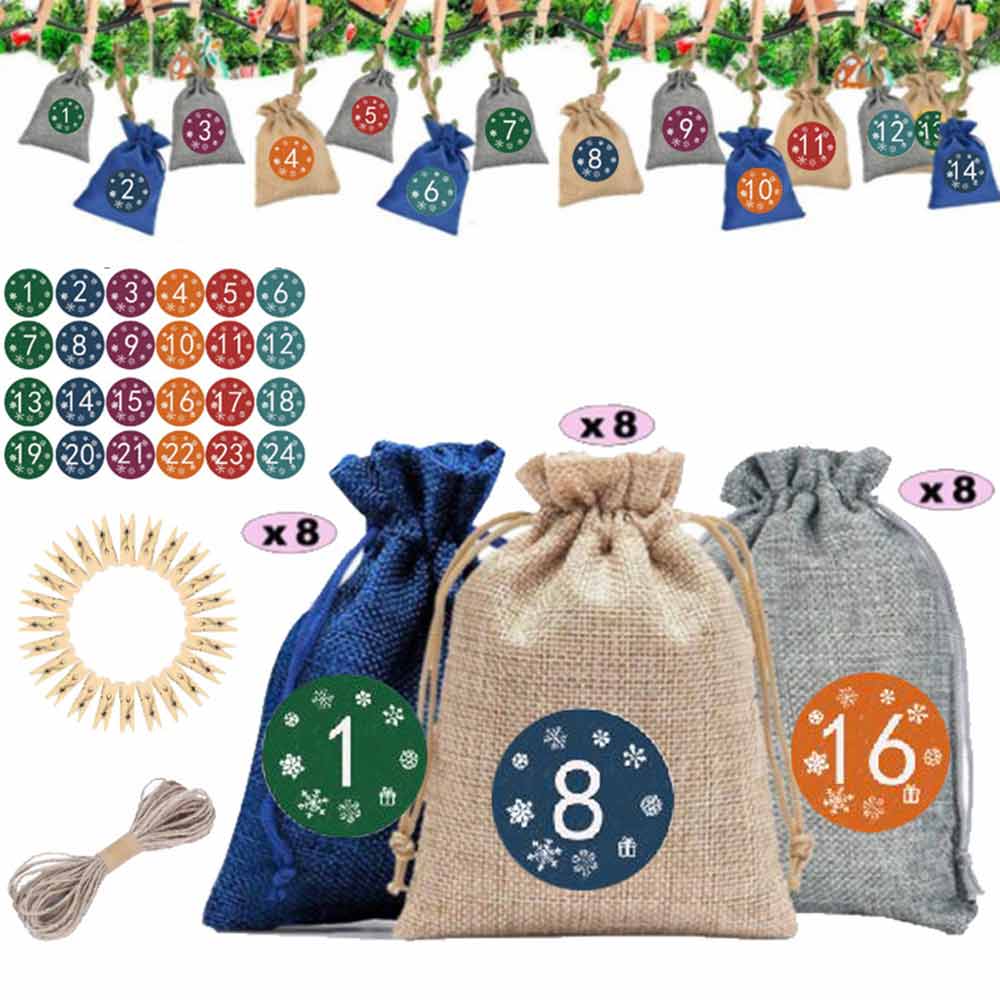 Package Includes: 24 * cloth bags (8 linen jute bags 8 grey 8 navy) 24 * stickers with the numbers 24 * wooden pegs, 1 * 10m hemp rope [advent calendar] 24 advent calendar bags 3 different colors (8 beige 8 blue 8 gray bag size: 10 * 14 cm) 24 digital stickers 24 wooden clips 10 m hemp rope. The cloth bag is made of natural linen and has no unpleasant smell. [Christmas Fun] Pack various small gifts into 24 bags to create surprises for your family friends and lovers making all mysterious puzzles. [Perfectly Matching] You can hang the cloth bag on the wall on the stairs or on the shelf. The cloth bag is tasteless non-toxic washable and recyclable. [Suitable for many occasions] The cloth bag is suitable for various occasions.