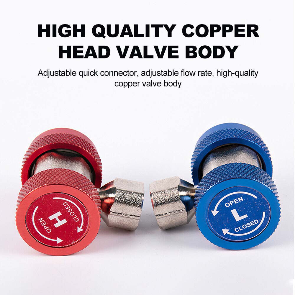 diagnosis, charging, or evacuation. Both high and low connectors are included. It can effectively avoid injury and refrigerant loss