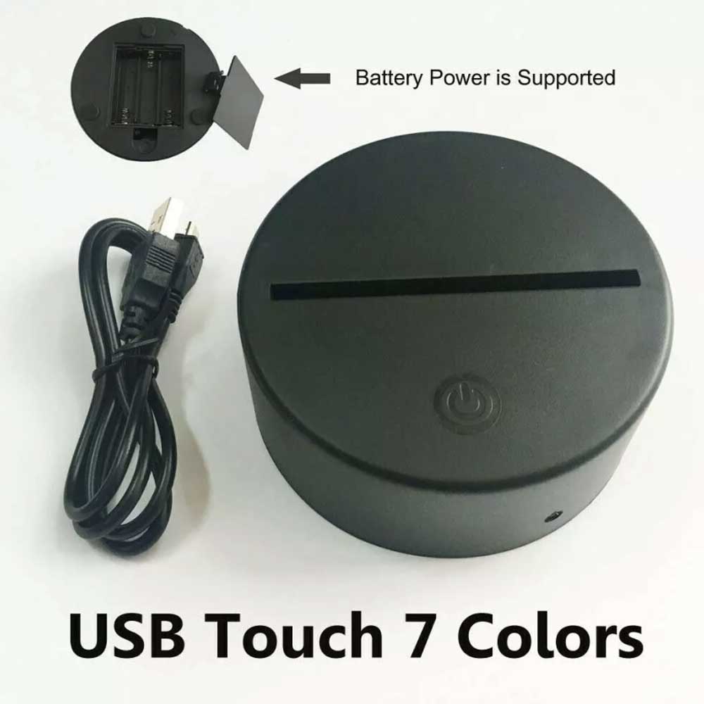 6.Using 3-AA batteries and USB Cable power supply,Touch the button to control the color change of the 3D lamp.