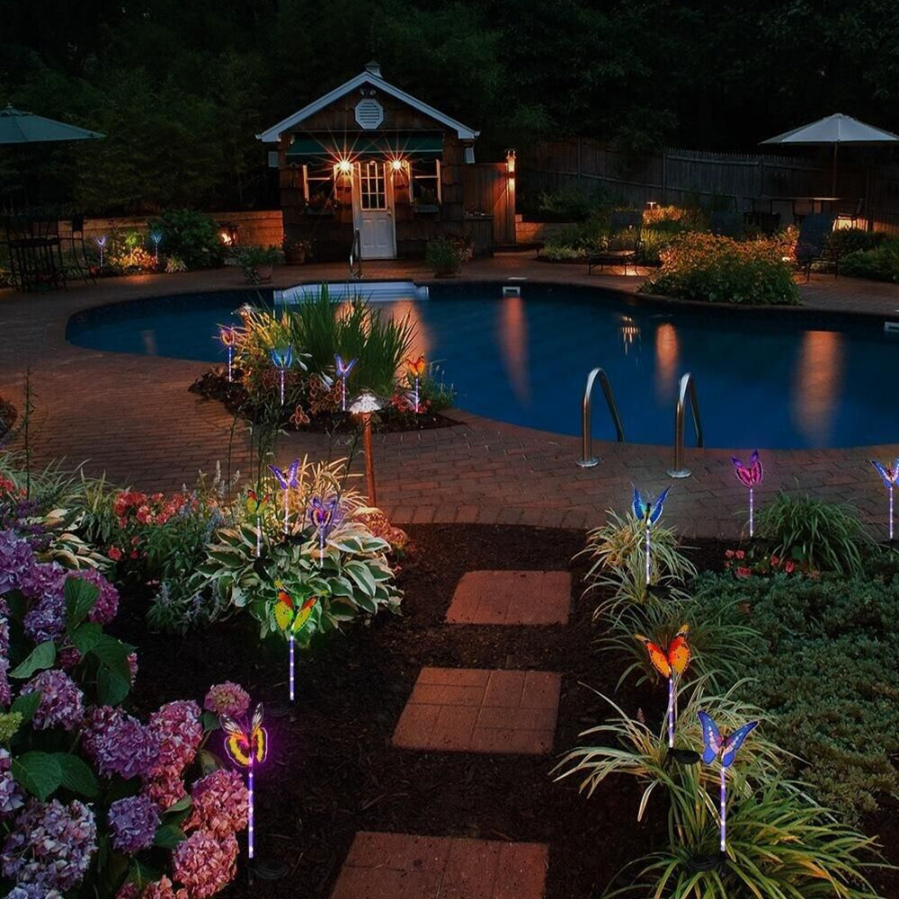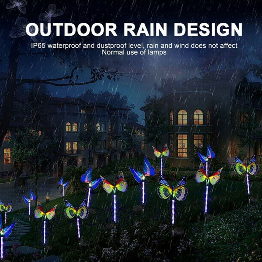 Butterfly solar garden lights automatically light up with 7 colors in the dark to illuminate your garden and pathway.