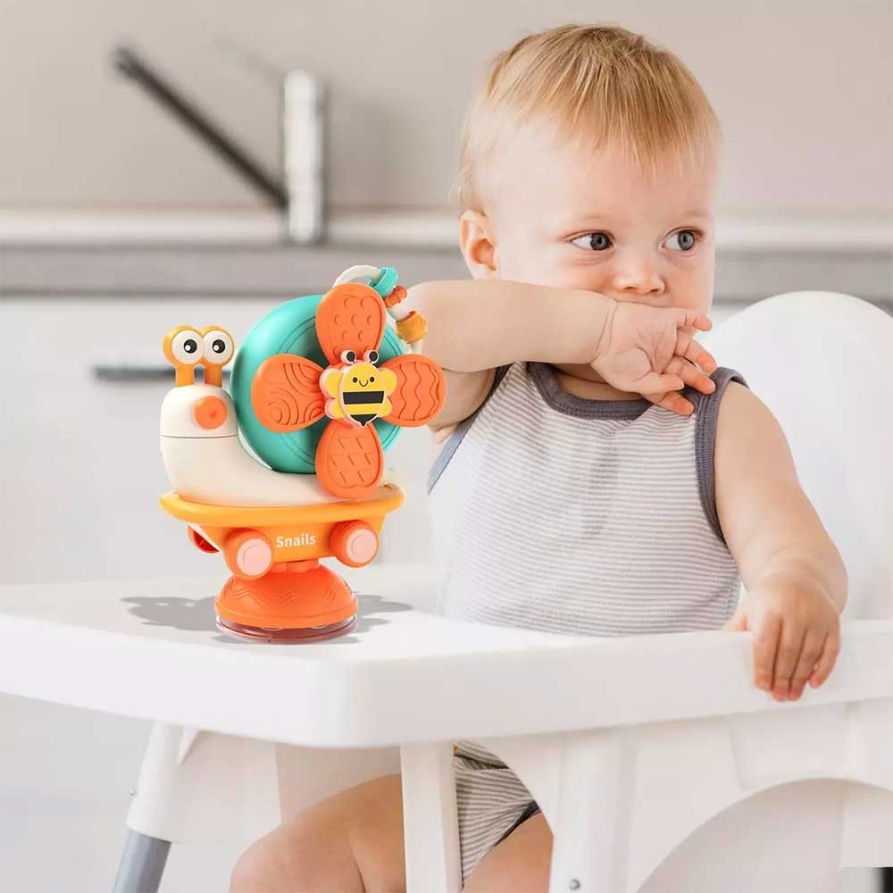 Introducing Windmill Snail - Baby Montessori Suction Cup Spinner Toys. When feeding, stick the suction cup spinner toy on the dining table to attract your baby's attention and help your baby eat obediently. When your baby takes a bath, you can stick spinning toys for toddlers on the bathtub and pull them to rotate and interact with the baby, so that the baby can take a bath happily.