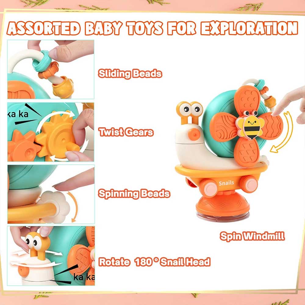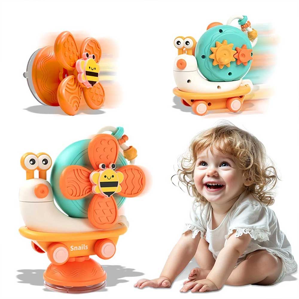KIDS PLAYMATE: 4 IN 1: Push-along vehicles, Gear toys, bead maze, and suction cup spinner toys for high chair trays. This bright, adorable snail-shaped toy attracts kids right away. It offers a variety of play options, helps with motor skill development, and provides hours of educational enjoyment.