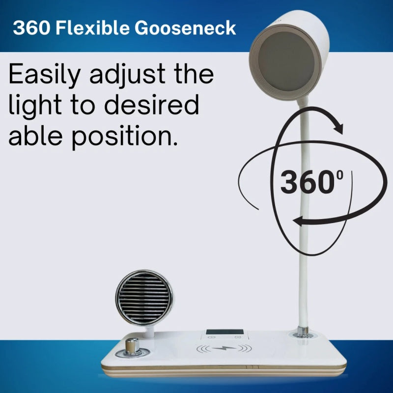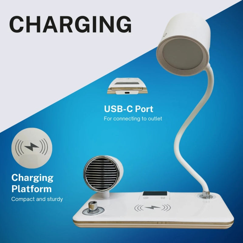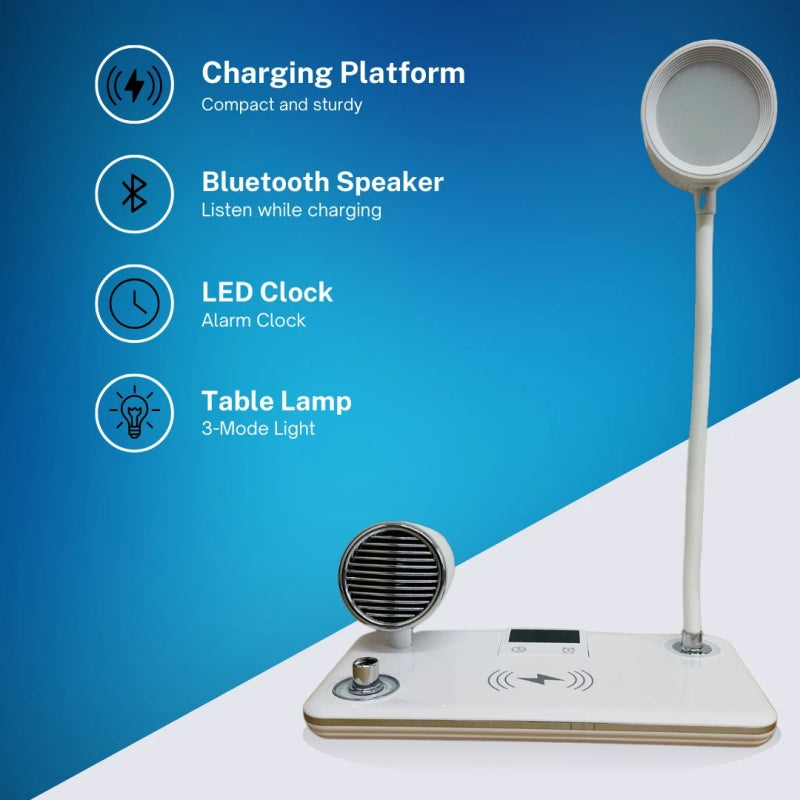 4 in 1 Wireless Charger LED Desk Lamp with Bluetooth Speaker, Clock, Charging