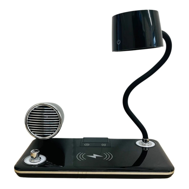 Multifunctional LED Desk Lamp – Combines a wireless charger, alarm clock, Bluetooth speaker, and dimmable LED light in one sleek design. Ideal for your computer desk, study area, or nightstand.