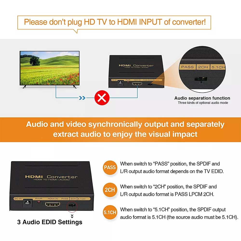Three audio output modes: HDMI audio extractor adapter has three audio modes to choose from PASS, 2.0CH, 5.1CH. RCA L/R output supports PASS, 2CH PCM, LPCM stereo audio; optical SPDIF output supports PASS, 2CH PCM, 5.1CH Dobly Digital, Dobly True HD, DTS-HD, DTS. note: this HDMI sound extractor is not supported.