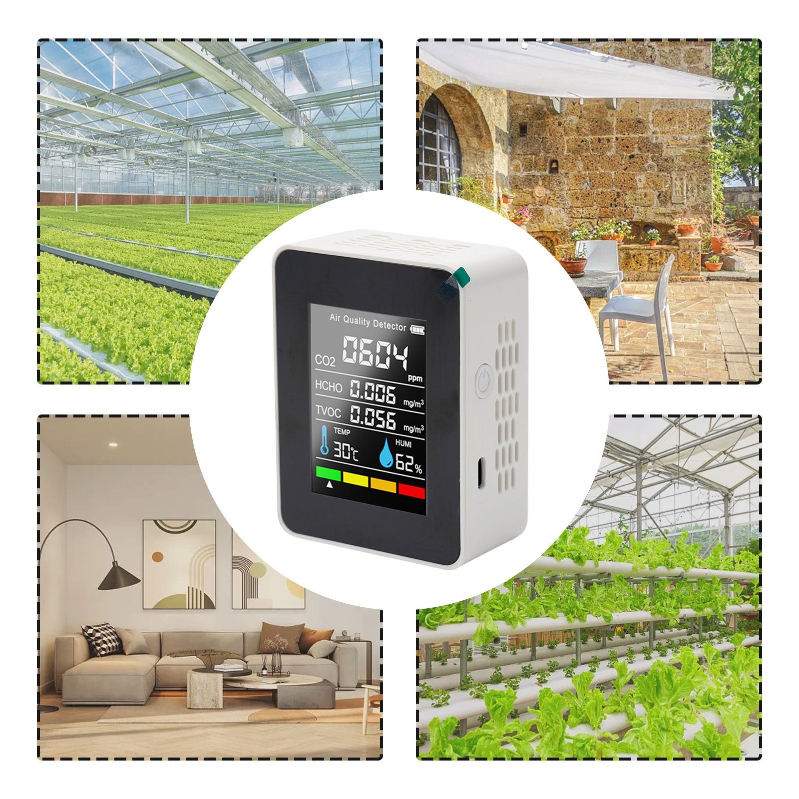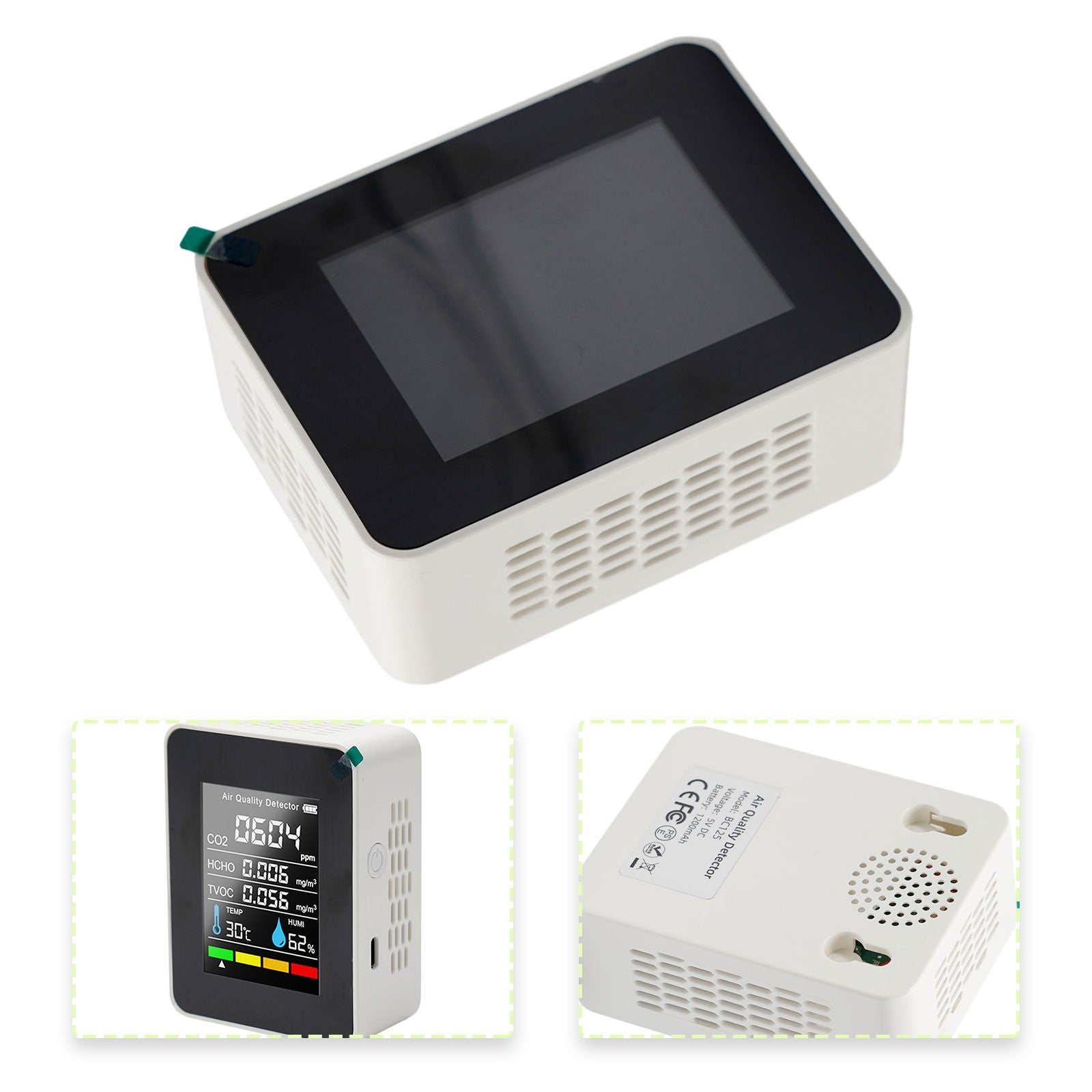 📊 5-Parameter Real-Time Monitoring: Simultaneously tracks CO₂ (400–5000 ppm), formaldehyde (0–0.6 mg/m³), TVOC, temperature, and humidity.