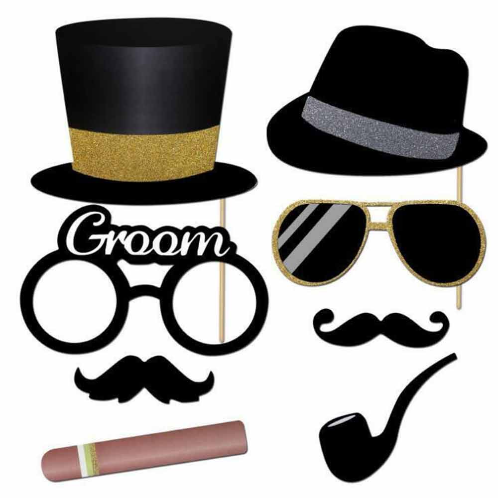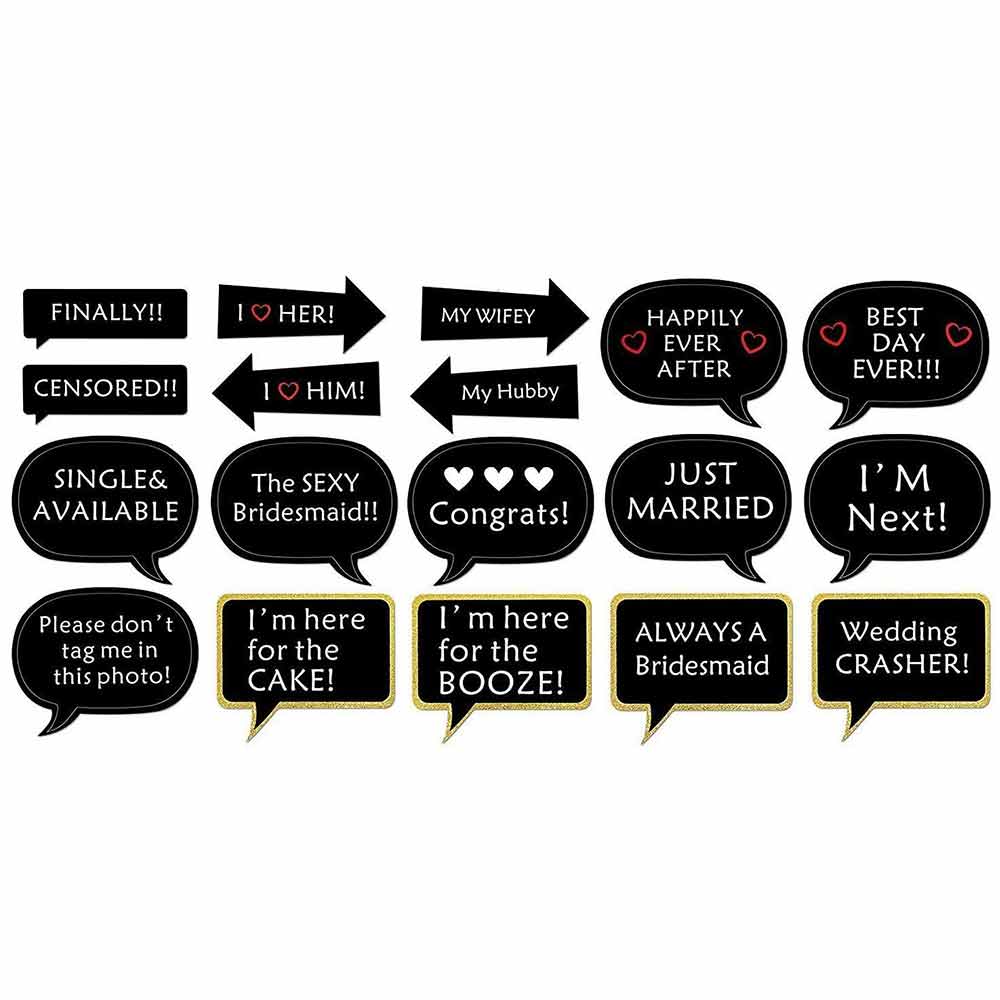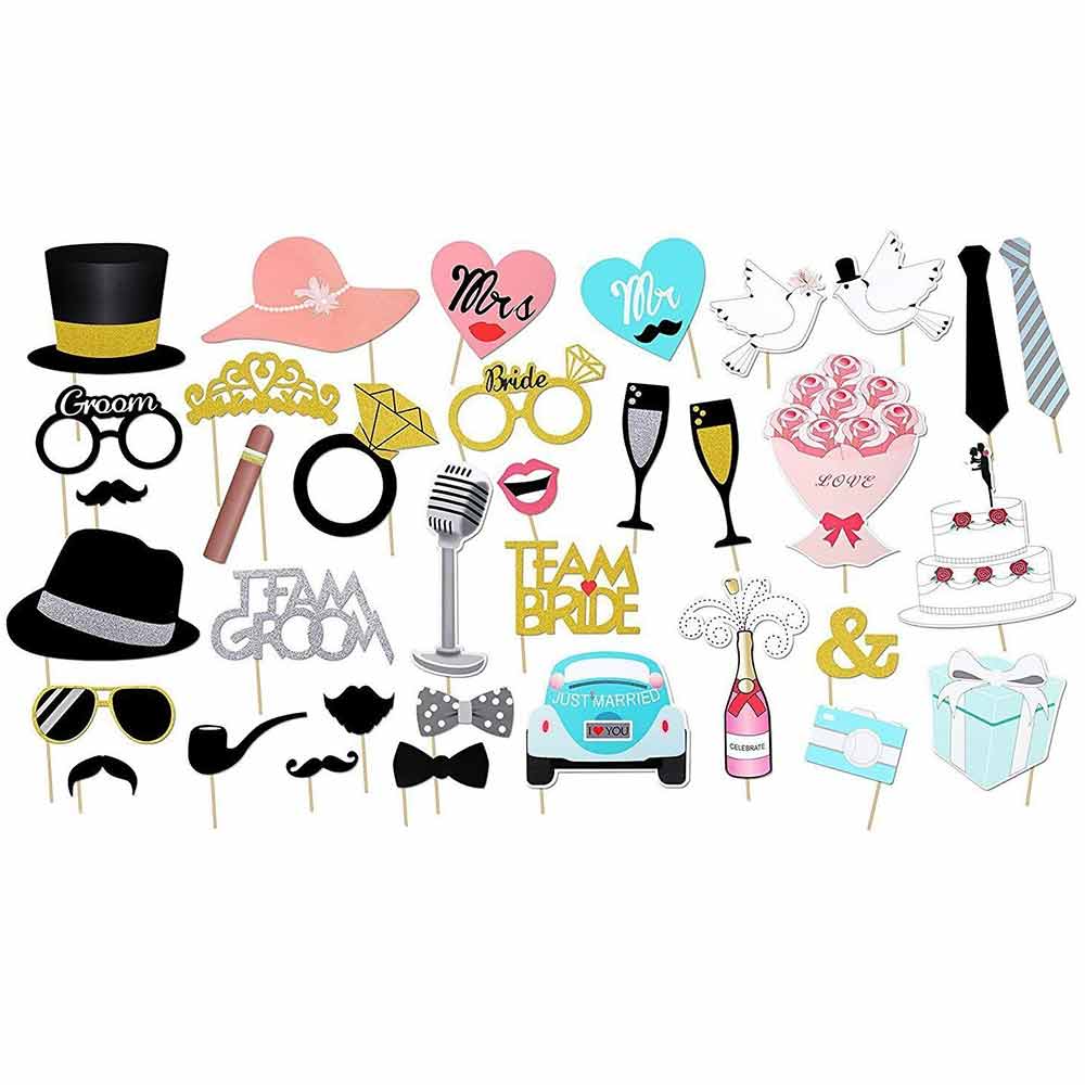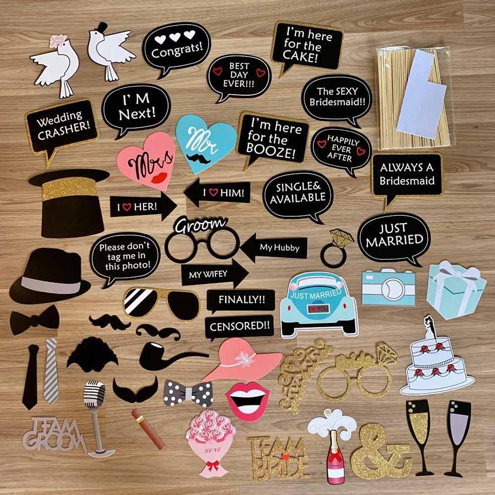 This funny photo booth props includes 52 pcs: mustaches, Mr and Mrs, eyeglasses, hats, wedding cake, wine bottle & glasses, love birds, some romantic words and so on that you can combine as many as you like!