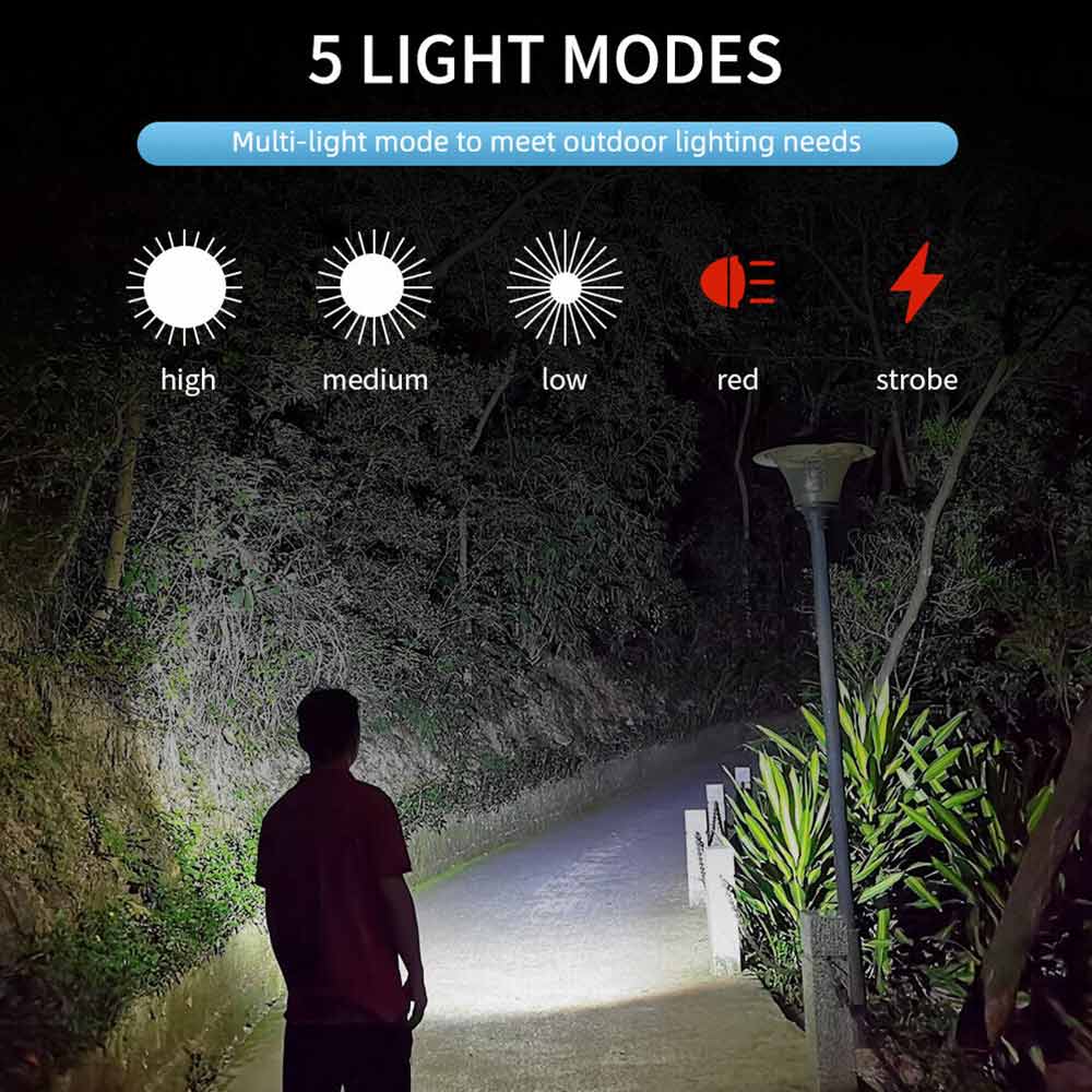 1. 5 Light Modes: High Light--Mid Light--Low Light--Red Light--Strobe