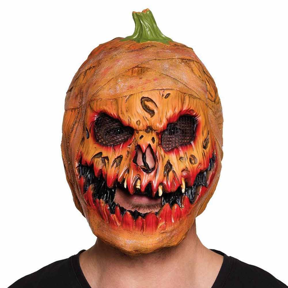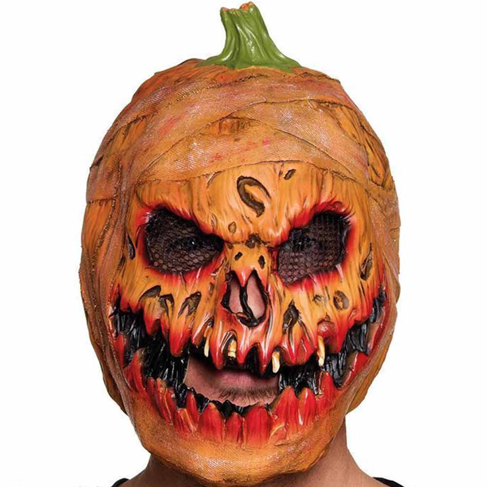 Wear this creepy pumpkin head mask for Halloween! The mask a scary grin. The eye holes have black mesh concealing your eyes.
