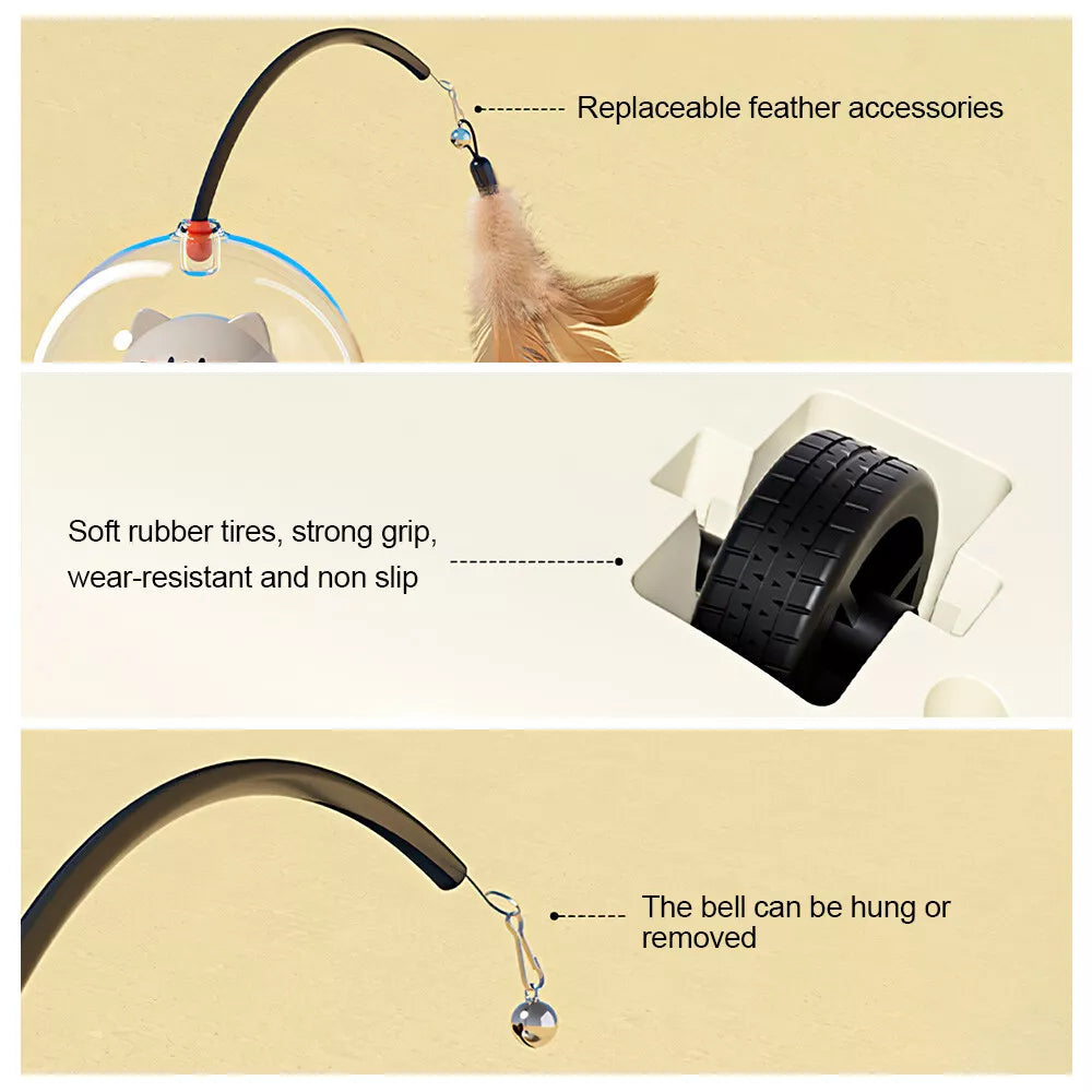 1. Sturdy Material: No more rolling noises on the floor with our electric interactive cat toy. Made of ABS material and TPR-wrapped wheels, this toy is safe and stable, providing more hours of entertainment for your furry friend