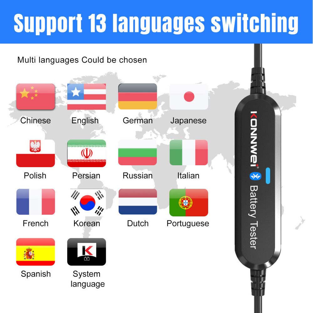 Car battery tester supports 13 languages: Chinese, English, German, French, Japanese, Korean, Dutch, Russian, Spanish, Italian, Portuguese, Polish, Persian