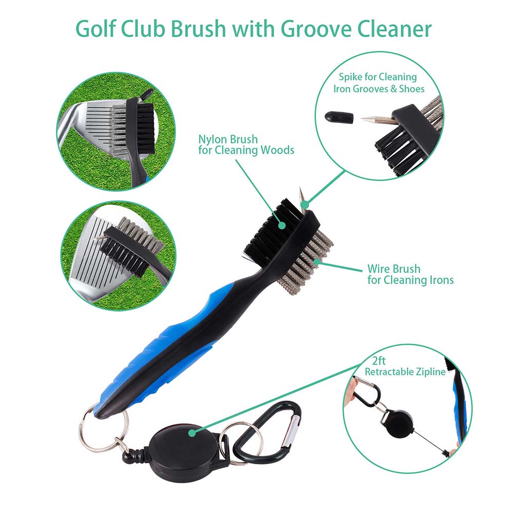 - GOLF CLUB CLEANING KIT: Everything plus more to keep your clubs and spikes clean. Retractable Club Brush with Brass bristles for cleaning irons. Soft Nylon bristles for cleaning woods. Sharp Spike for cleaning golf shoes & grooves.