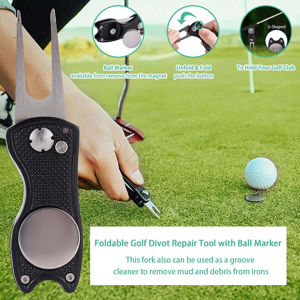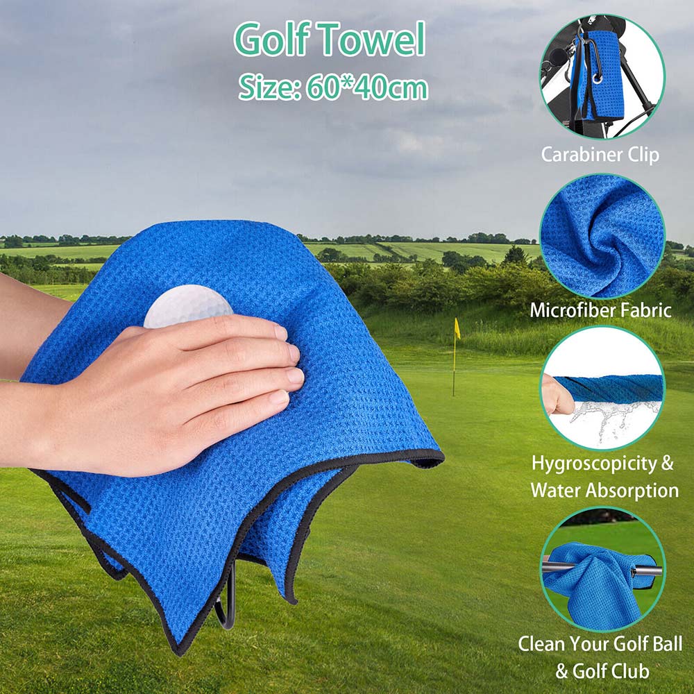 - 5-IN-1 VALUE PACK: 16 x 24 Inch Tri-Fold Microfiber Golf Towel, Golf Club Brush with Groove Cleaner, Foldable Divot Tool with Ball Marker, Club Groove Cleaner Set and Golf Tee Holder - Golf Club Cleaning Kit.Premium Golf Accessories Set for all golf lovers.