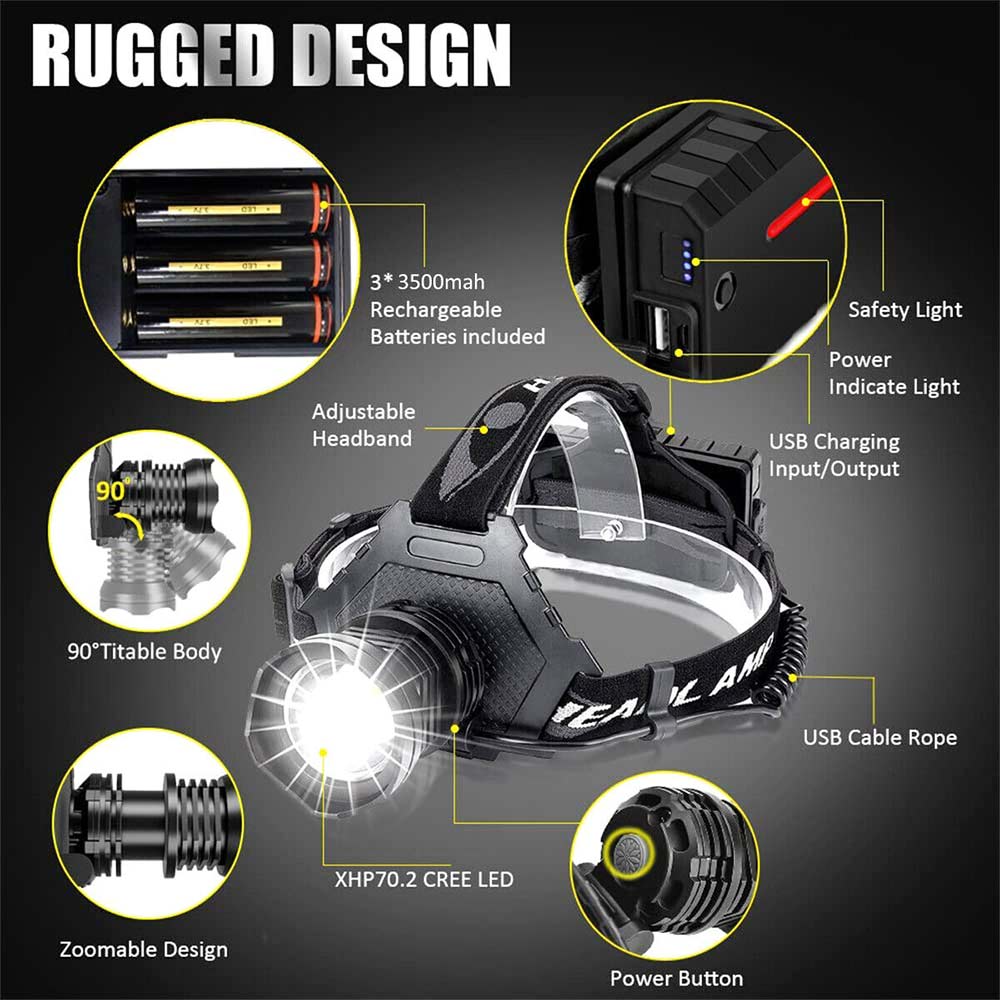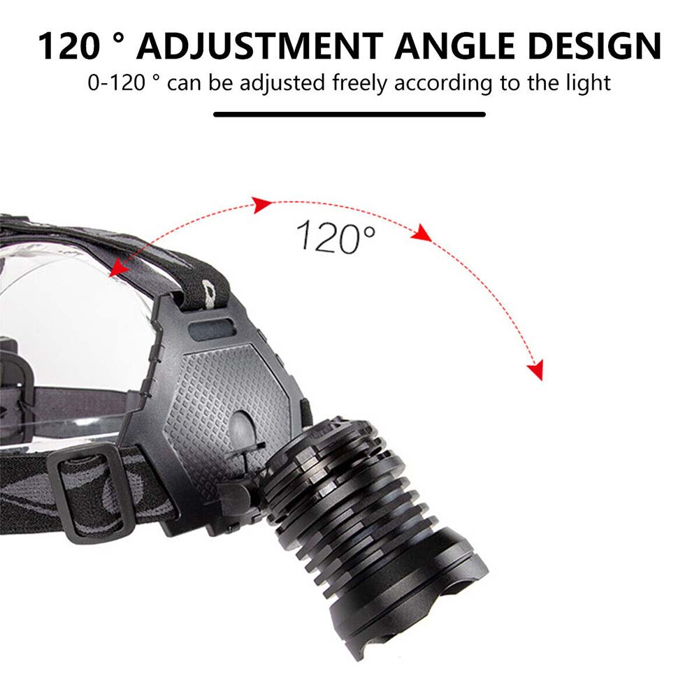 【Rechargeable & Power Bank】The LED headlight has built in 3500mAh battery, and it can be last up to 12 hours after each charge, about 5 hours of full charge. The LED headlamp can also used as a power bank to charge your phone, camera, and more.【Adjustable Headband & 120° Rotating 】Our head lamp has a adjustable headband which is suitable for any head size. The illumination angle of the head lamp can be rotated within 0-120 degrees, allowing you to freely direct the light accurately.