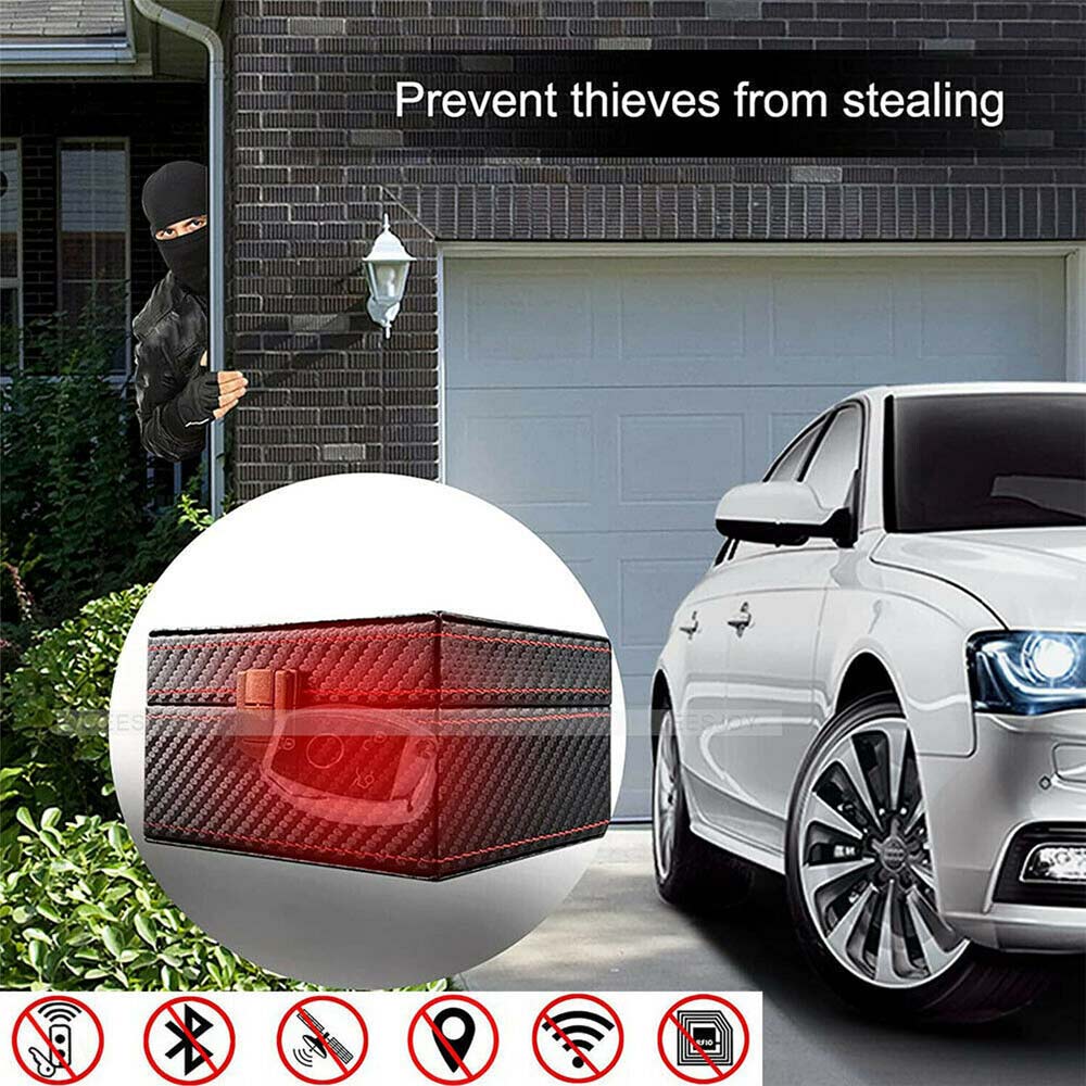 【 Faraday Box】Size: 11.5*9*6.2cm. It can store 4 car keys, including key rings and door keys, and mobile phones. Therefore, all family members' car keys and mobile phones can be put together. The double-layer carbon fiber PU material can firmly block the signal and ensure signal isolation.