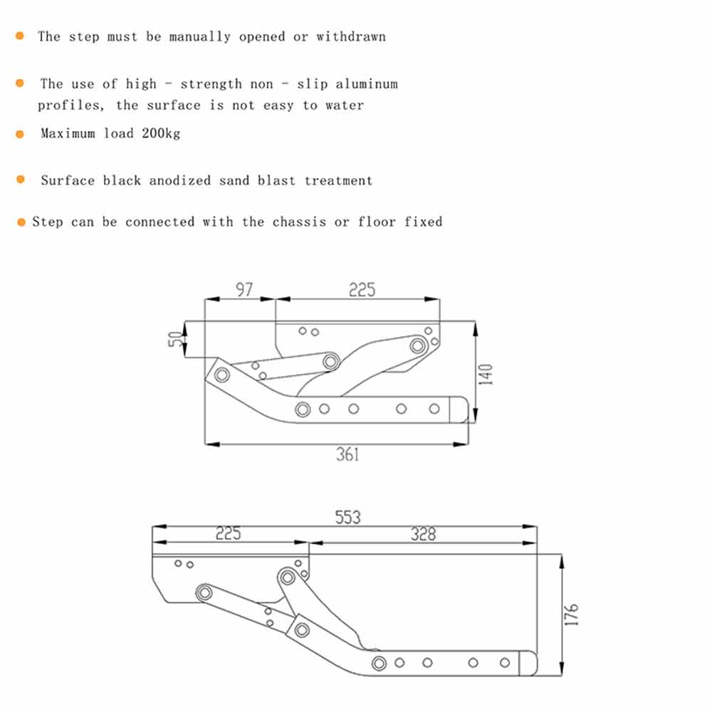 Overall drop height when open: 176mm- Maximum static load of 200Kg
