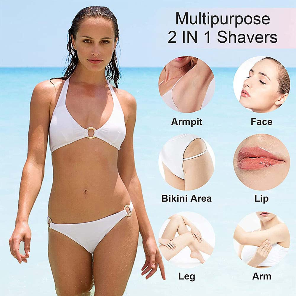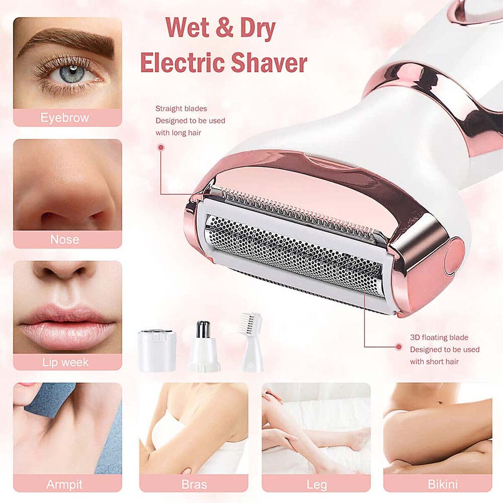 The 4 in 1 electric shaver kit includes 4 multi-function interchangeable shaving heads, which can instantly remove the hair on the face, arms, legs, bikini line, nose, eyebrows and other parts, making your skin smoother, so you don't need to worry about excess unsightly hairs on any part.1. Bikini & Body Trimmer - The blade is close to the skin and will not cause damage and irritation to the skin. Suitable for arms, legs, armpits, back, body and bikini line to achieve a smooth effect.