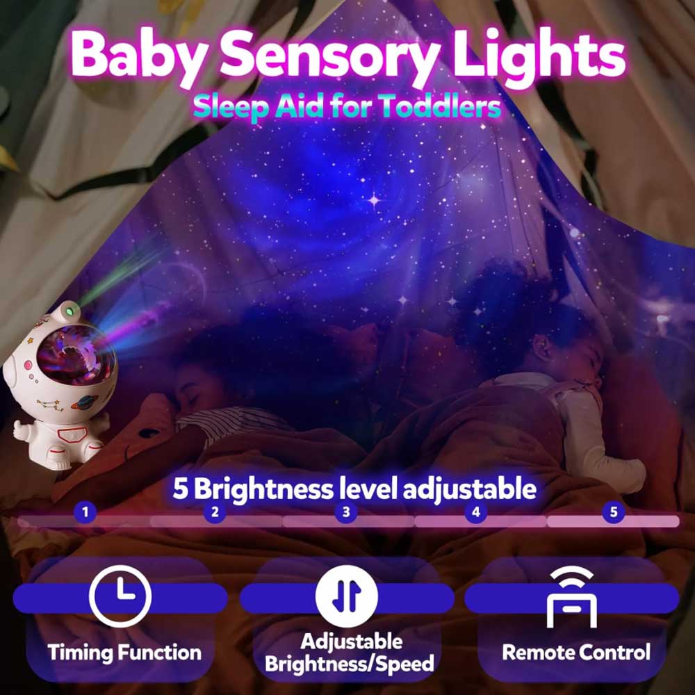 - Soothing Sensory Toys:There are 7 colours and 1 multi-colour mode in total.The changing soft nebulae help to calm and soothe the child from a state of restlessness.The cute astronaut shape with soft light is the perfect companion for children. Not only suitable for blackout tent but also for bedrooms.