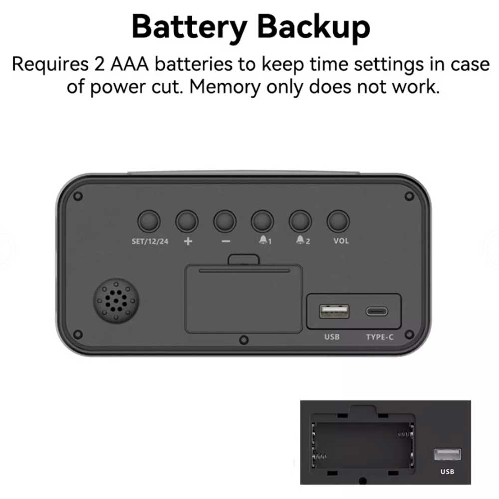 Our Alarm Clock is plug-in use, while the battery serves as a backup to maintain the alarm and time settings during power outages.
