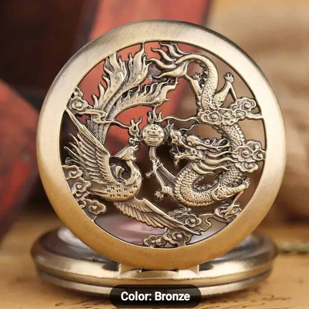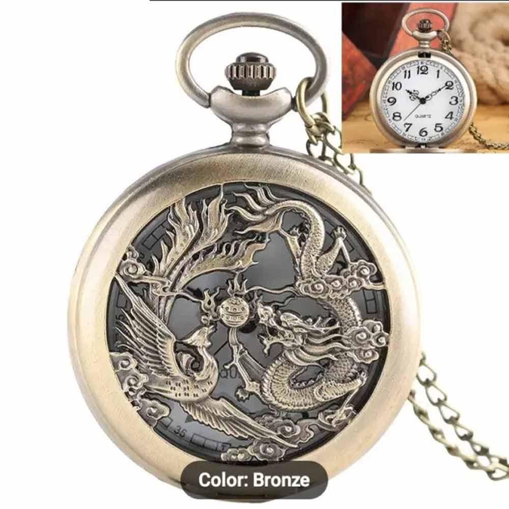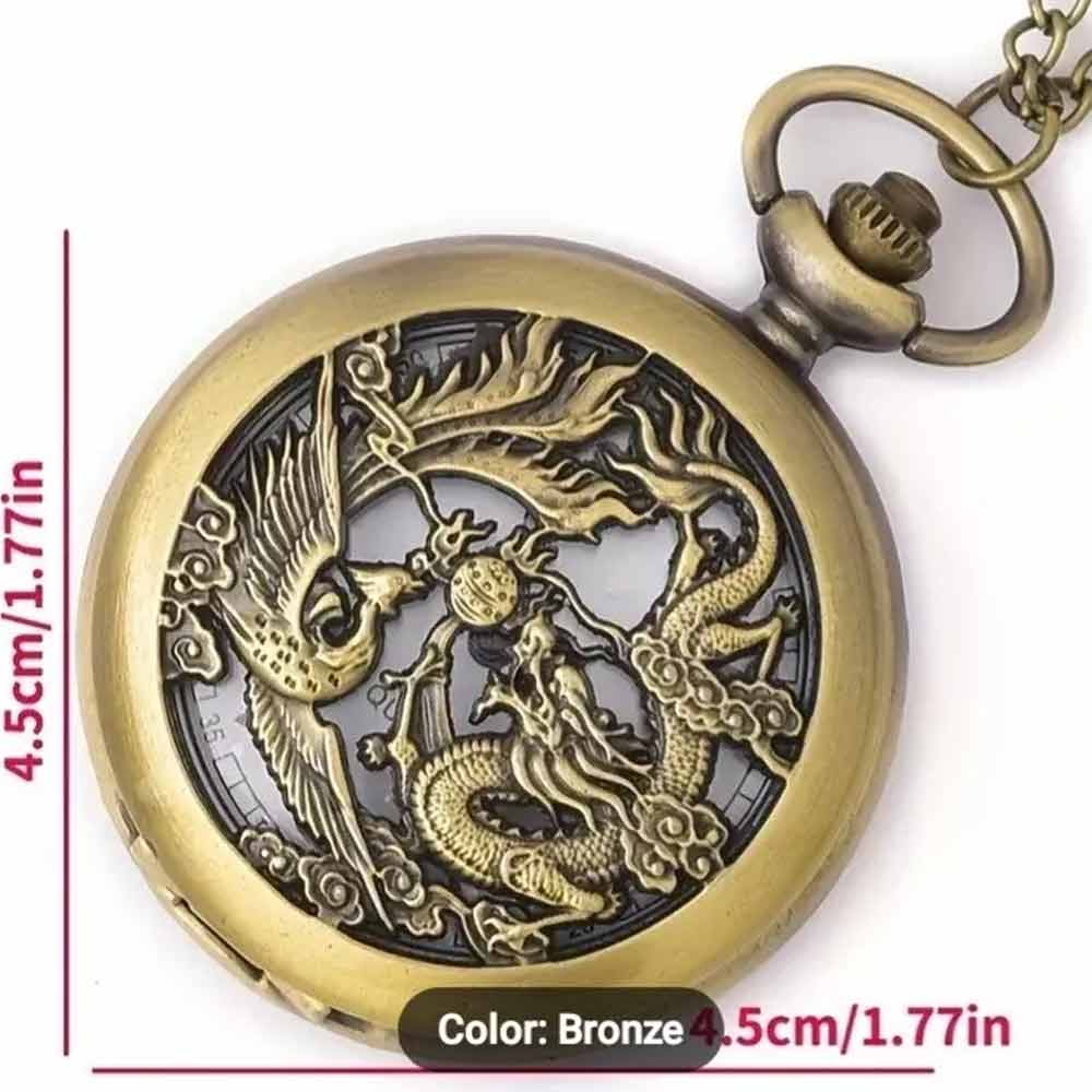 Dragon and phoenix Vintage Quartz Bronze Pocket Watch with Chain