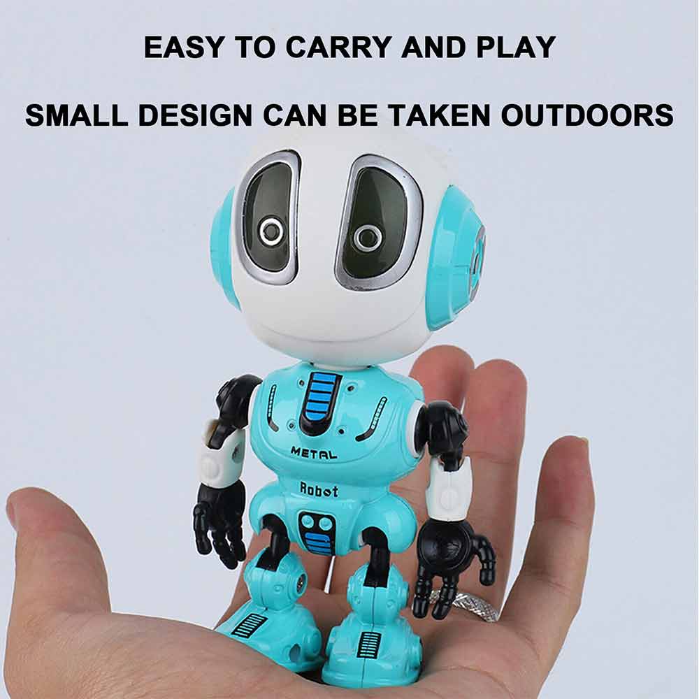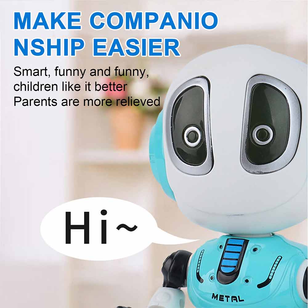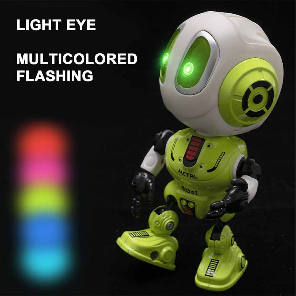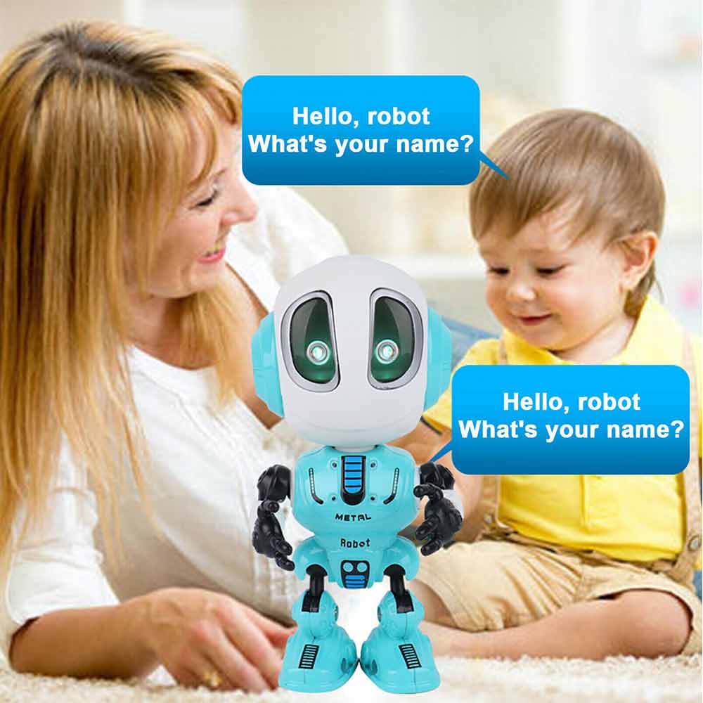 3. Your little one just needs to tap the little button on the head to turn it on, having four kinds of sounds and five colorful flashing light eyes fun by tapping its forehead. Tap the robot's button twice and talk - this cool robot toy repeats everything you say.