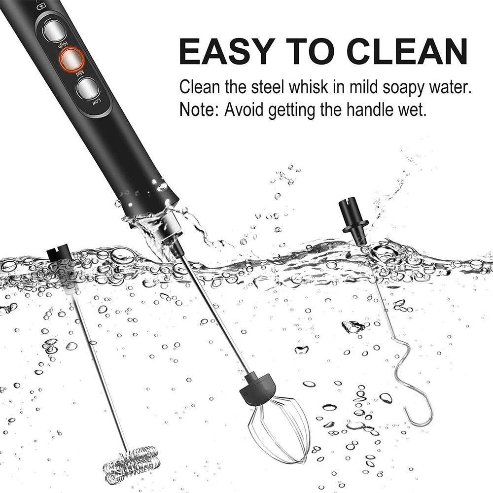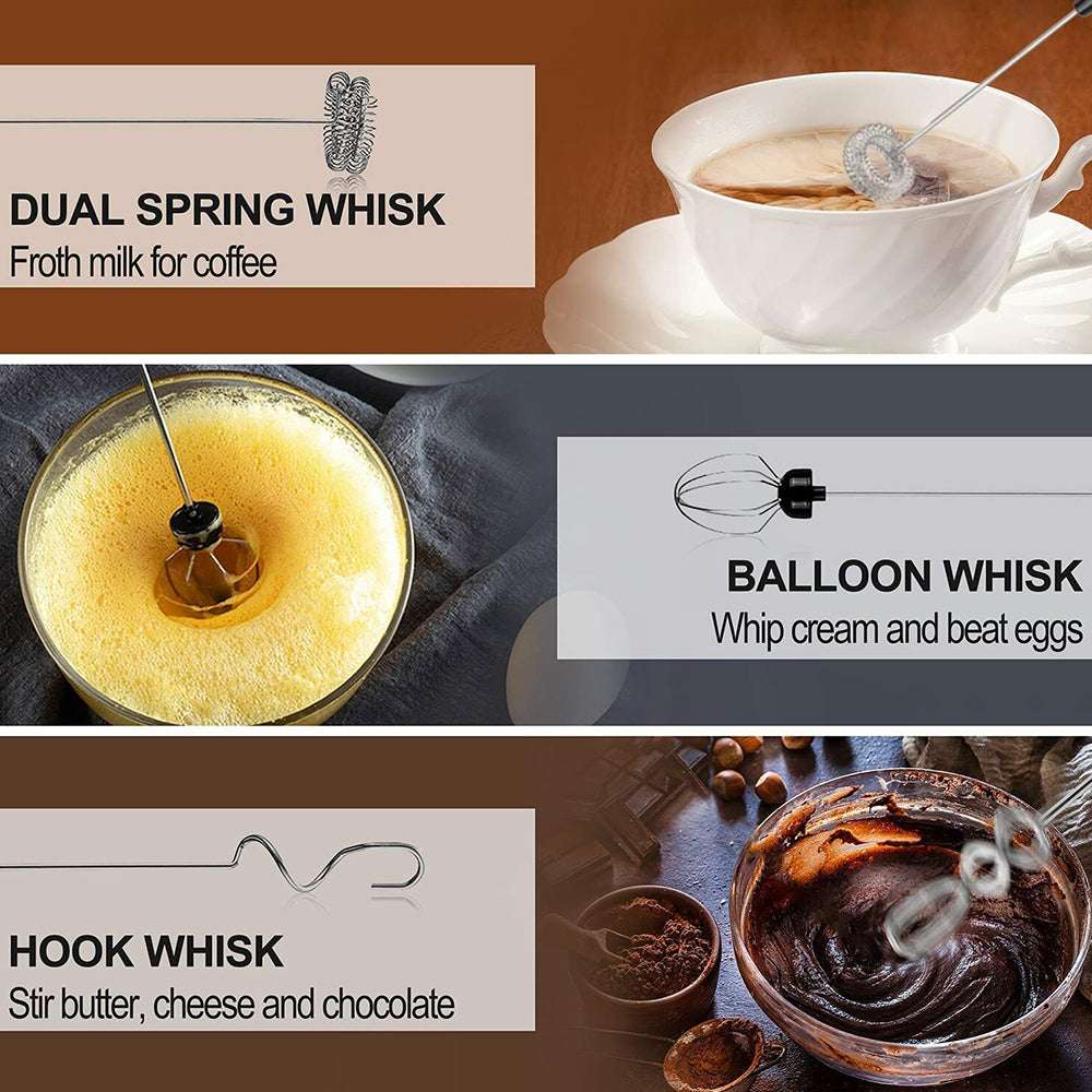 【3 IN 1 Blender】Our electric stirrer provides three stainless steel whisks optional: Balloon Whisk Head,Hook Whisk ,Egg Beater Head.Hook whisk can be used to mix baby formula.Hook whisk is more suitable for jam , baby nutritional supplements, protein shakes.Balloon Whisk is perfect for creating foam for Coffee, Latte, Cappuccino, Hot Chocolate.
