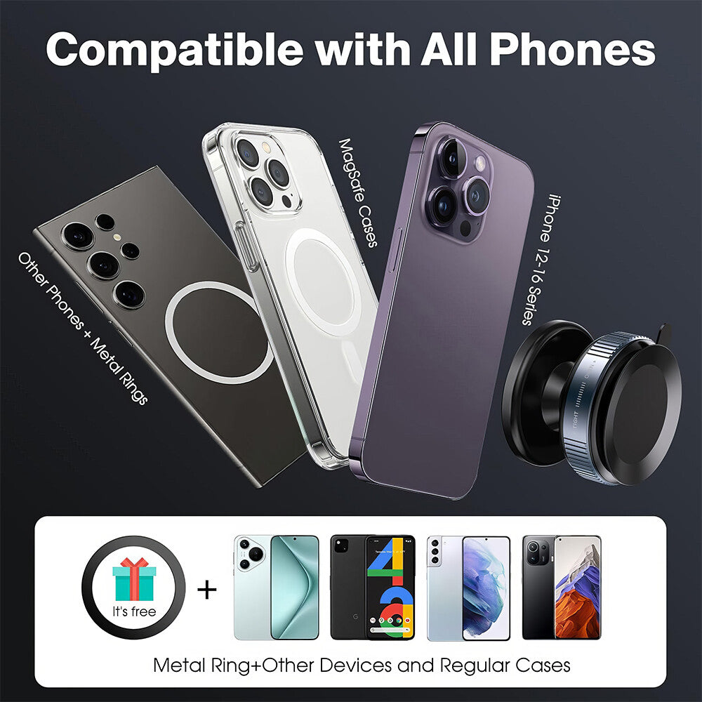 6. Designed for MagSafe:The 2025’s most stylish magnet phone holder, MagSafe-compatible, is designed specifically for iPhone 16/15/14/13/12 Pro Max, Mini, and official MagSafe cases, as well as other magnetic phone cases. The car cell phone holder securely attaches directly to these devices without the need for a metal plate. All Android phones are also compatible with the included metal ring, making it suitable for cases and non-MagSafe phones.