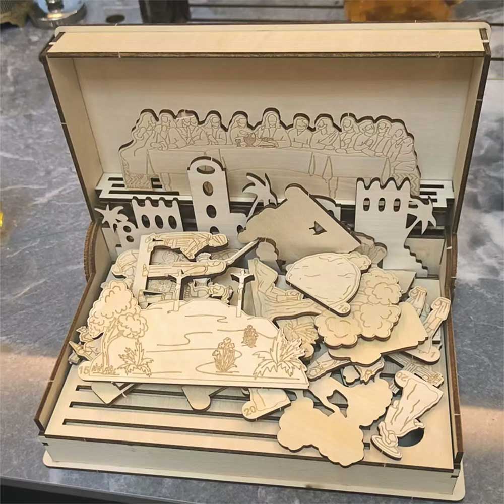 2. Interactive learning: Very suitable for teaching the events that led to the resurrection of Christ. This set aims to inspires learning and awe. It has 30 intricate laser cut wooden veneers stored under slotted brackets for easy access during class.