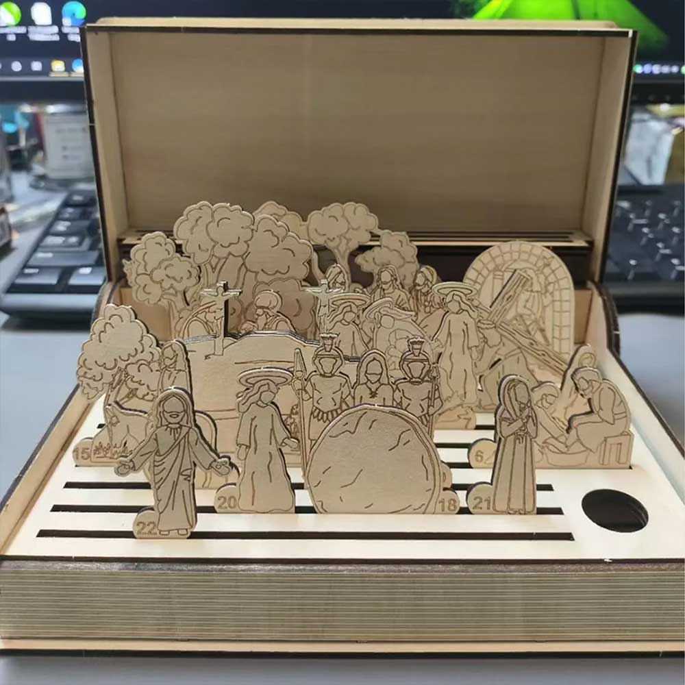 3. Educational booklet: Explore Easter narratives with a simple but informative booklet, including scenes and corresponding scriptures. These wooden figurines are numbered and correspond to the numbered images in the booklet.