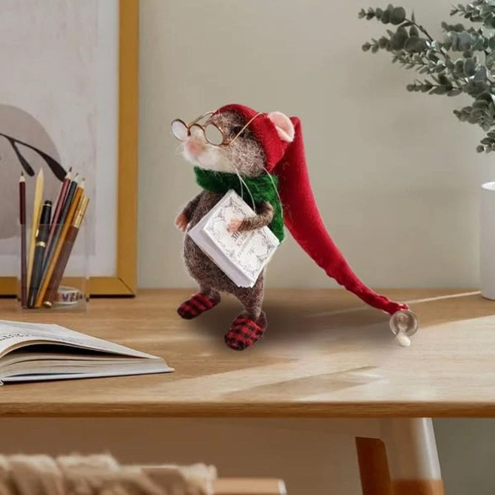 Handmade Needle Felted Christmas Mouse Ornament - Cozy 10cm Felt Animal Doll for Xmas Tree Decor