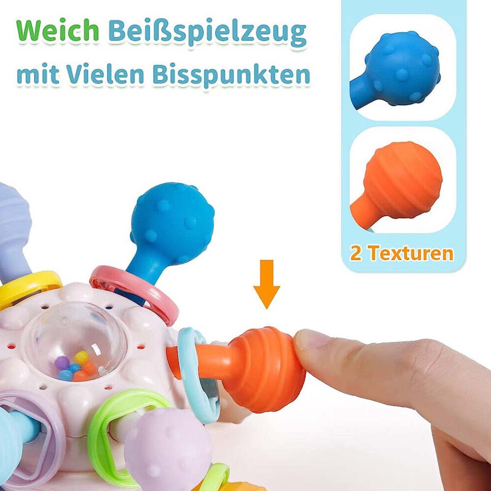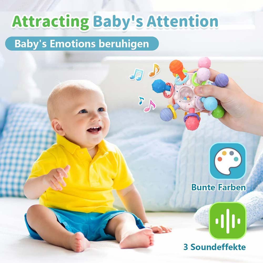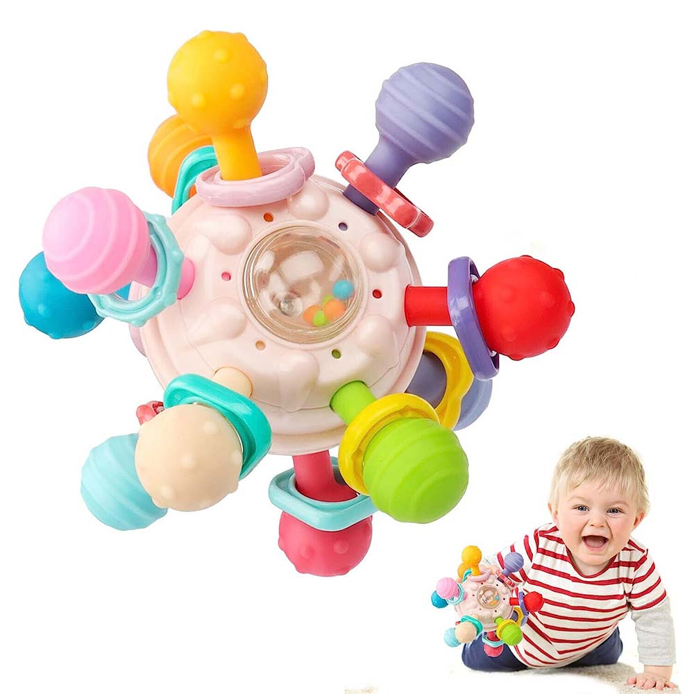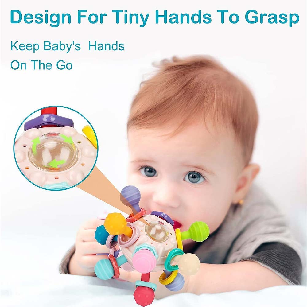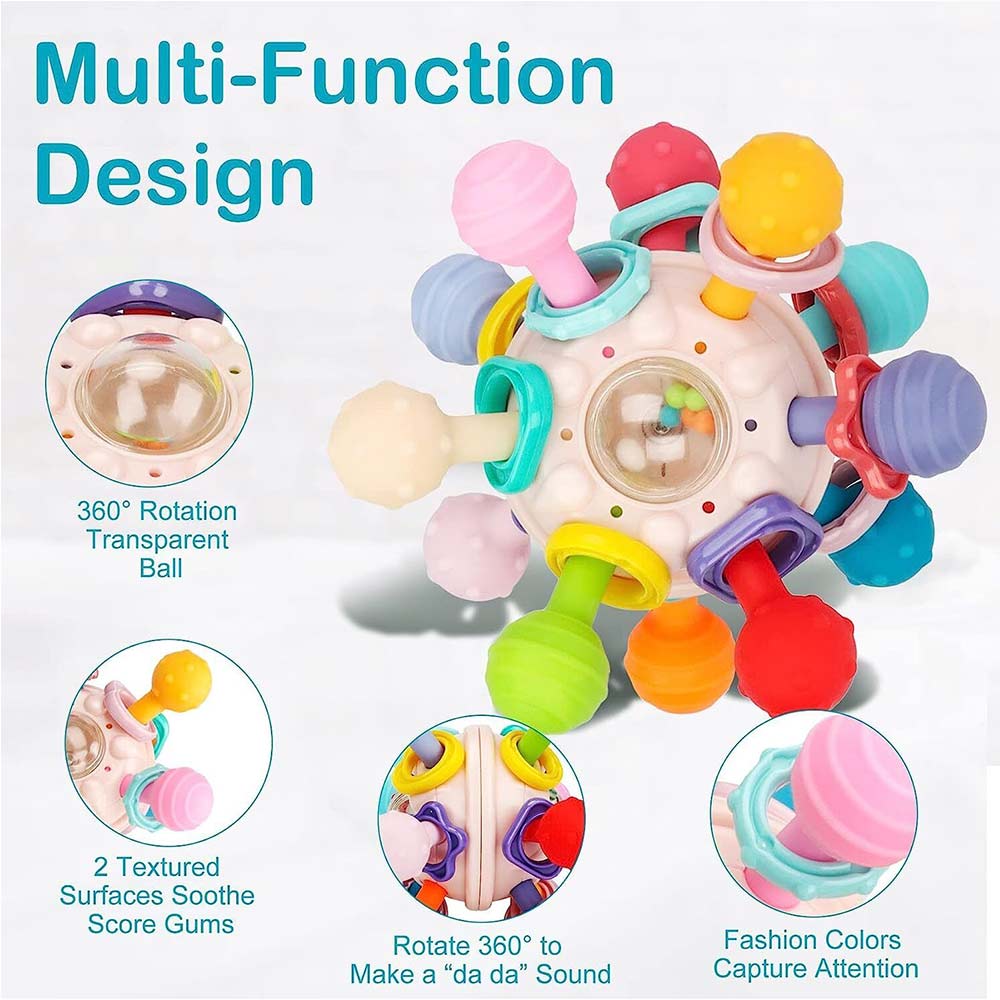 -Bright colors can increase your child's interest and develop your child's cognitive ability. The rattle ball that makes fun sounds stimulates baby's sense of hearing and grabs their attention. Different textured surfaces, good for developing the sense of touch.