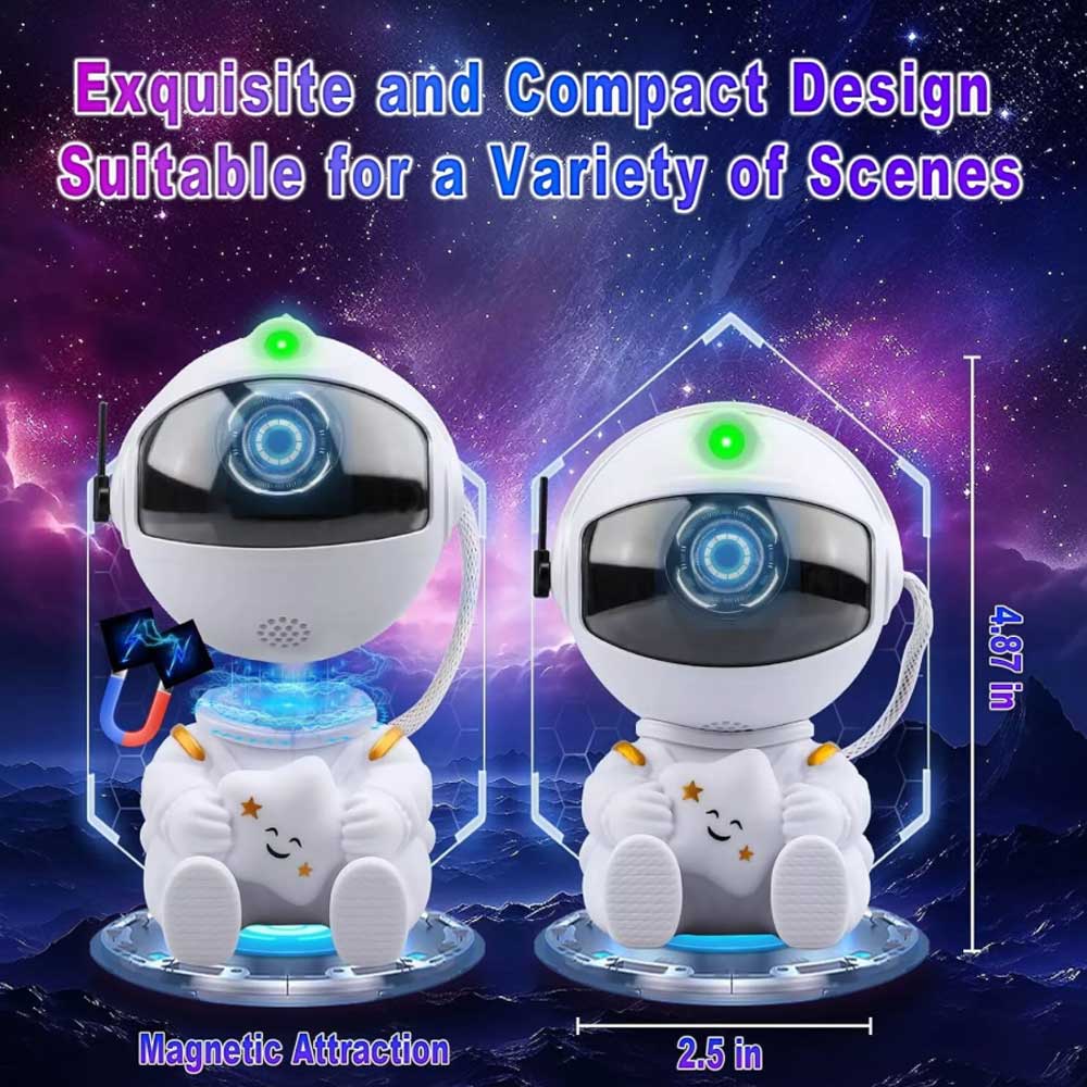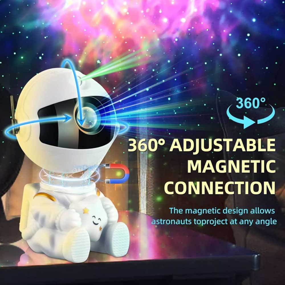 this astronaut projector night light, the starlight of the starry sky and the Milky Way, leads you to explore the mysterious and huge starry sky. The astronaut's head can be rotated 360 degrees by magnetic force. By turning the head, you can project stars and fog lights to any desired place