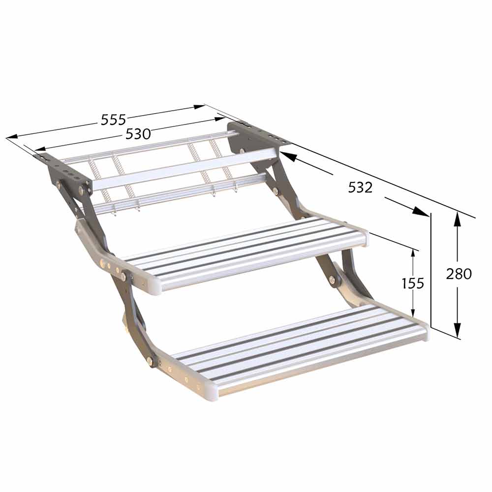 This double pull out aluminium step features outstanding design together with a premium quality build & finish. It is stylish a yet tough and lightweight step, easy to pull out and fold away. The double step is ideal for Off-Road Caravans and Camper Trailers which have an elevated entry into the RV.