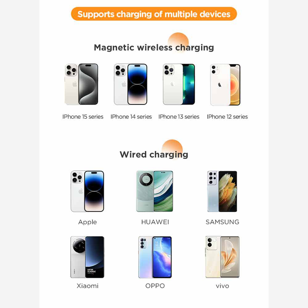 15W Magnetic Wireless Charging: Delivers 5W / 7.5W / 10W / 15W for MagSafe-compatible iPhones and Qi devices.