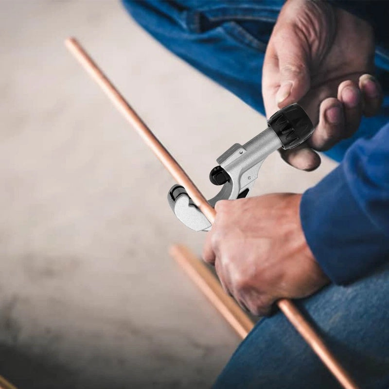 This high-quality pipe cutter is designed for fast and precise cutting of various materials, including copper, brass, aluminum, thin-walled steel, and plastic. It features a special tapered ball bearing design that minimizes resistance, ensuring smooth and accurate cuts. The handle is crafted from durable aluminum alloy, while the blade is made of imported SK5 steel, providing excellent sharpness and longevity. The ergonomic knob ensures a firm grip, allowing for quick and effortless pipe cutting. Compact in size (14*6cm) and lightweight, it is a must-have tool for both professional plumbers and DIY enthusiasts.