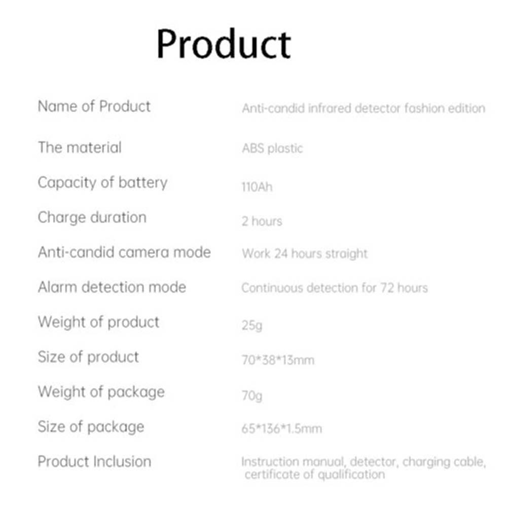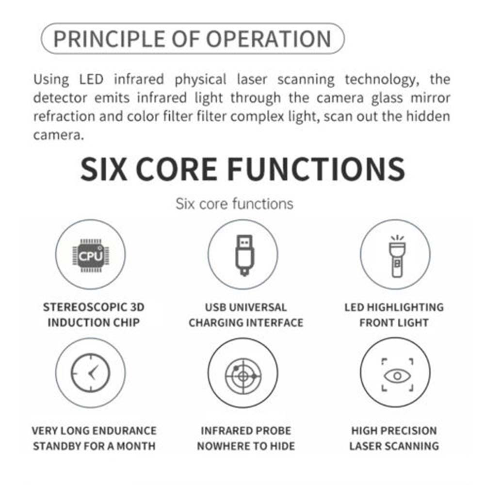 Infrared detection: Using LED infrared physical laser scanning and technology, the detector emits infrared light through the dual function of refraction of the camera's glass mirror and filter of complex light to scan the camera.