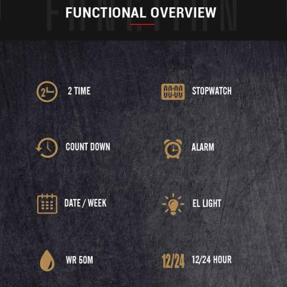 8.Function: 2Time, Chrono, Alarm,Date, Week, EL Light, 12/24 hour clock, Countdown