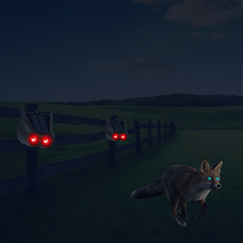 which stimulate red flame or the eyes of fearsome predators to fool and scare most invaders away from your area to protect your garden, yard, farm, vegetable fields, garbage cans, poultry, cats, dogs, pets, chickens and rabbits from attack.