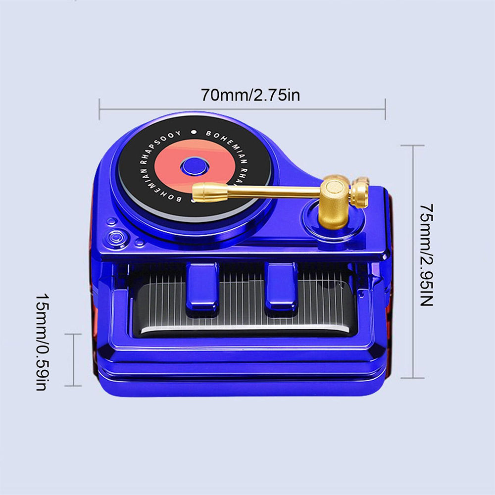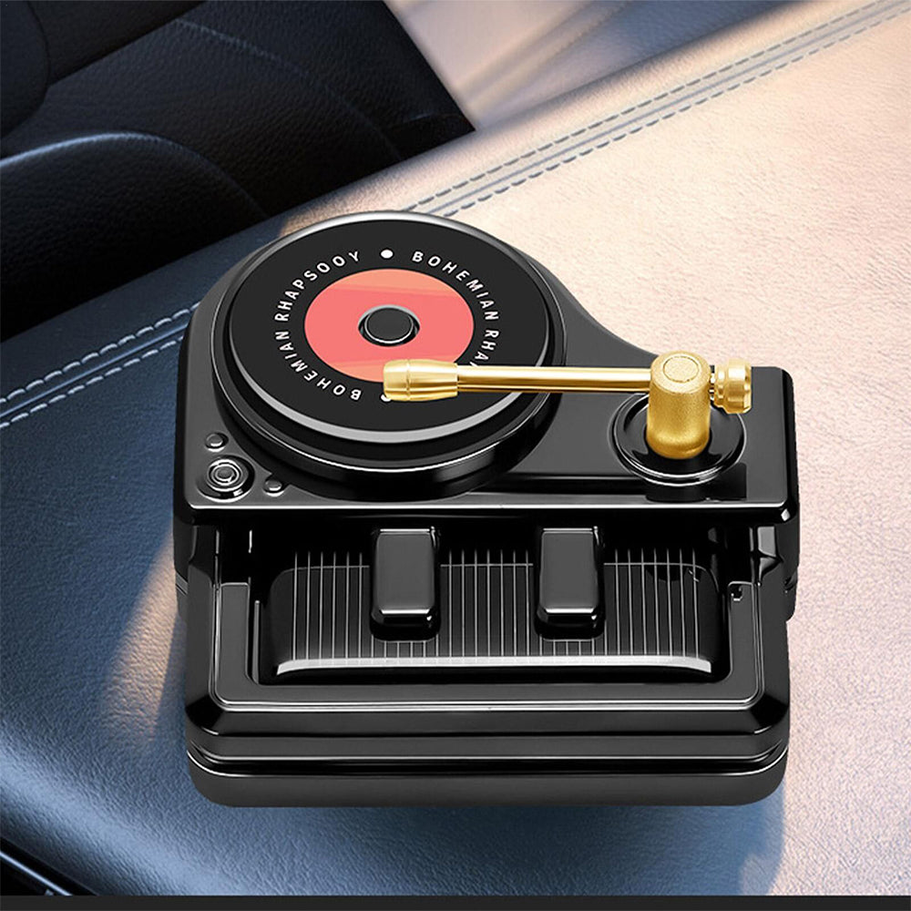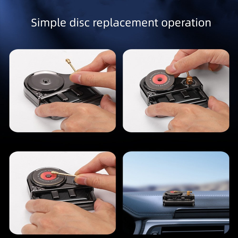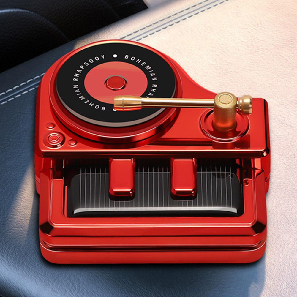 It is solar-powered. The record player part of this car fragrance diffuser air freshener will rotate under sunlight to diffuse the smell of the solid fragrance tablets. It requires no batteries or wires. And its unique shape will make itself a unique car dashboard decoration.