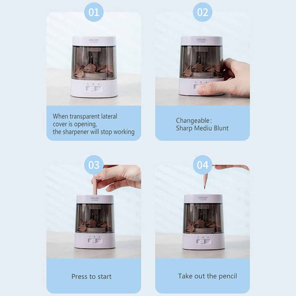 - SAFETY: When the transparent lateral cover is opening, the sharpener will stop working and avoid hurting the kid's fingers.
