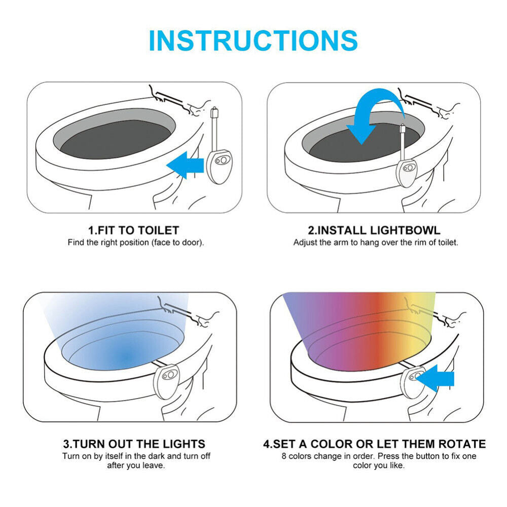 Flexible and Sturdy Arm,The arm of toilet bowl light can be bent to hang on the side of your toilet, no other tools required! Fit for most toilets and for other purpose as well.