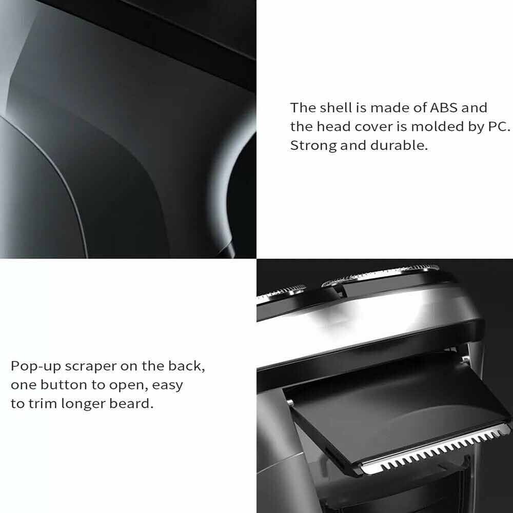 ● This razor has three sets of independently floating cutter heads, which add 1/3 shaving area than the ordinary double cutter razor. The cutter head has a smooth touch and elastic veneer to adapt to different face contours.