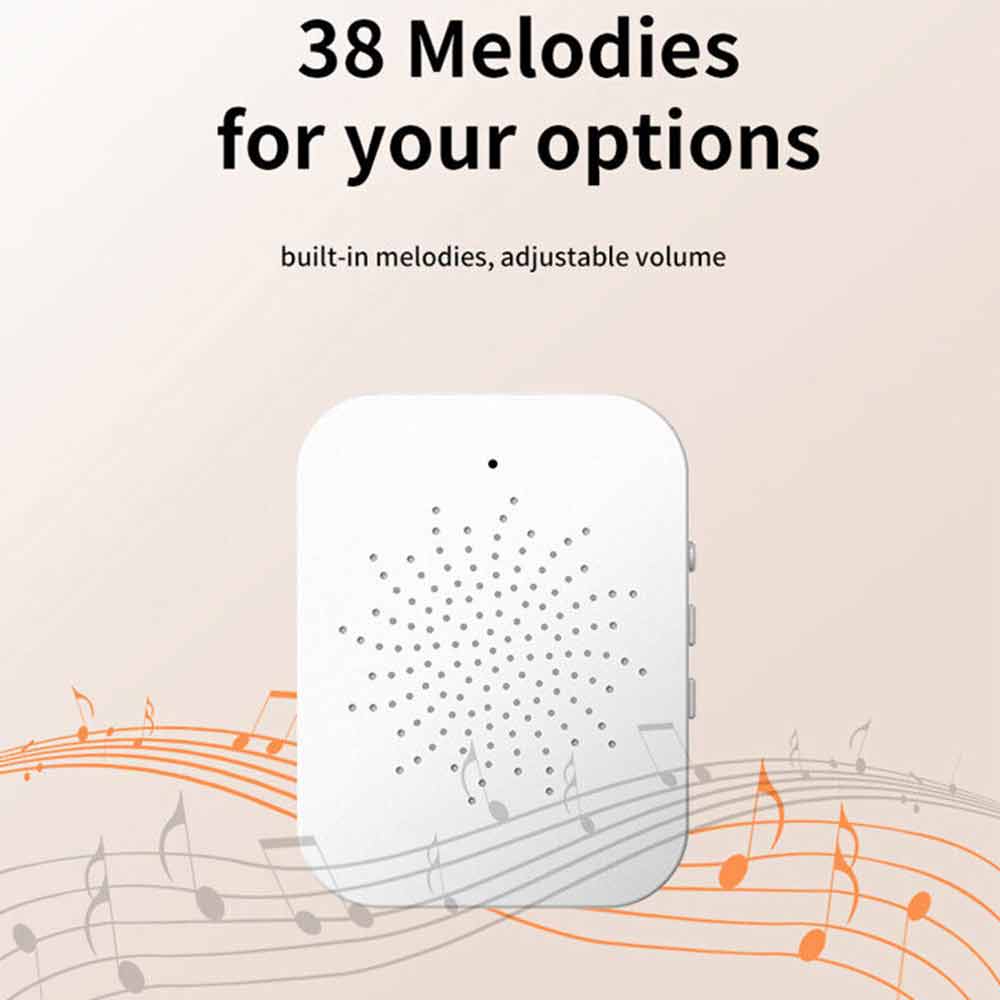 【Wireless Indoor Chime】: The smart doorbell comes with a wirelesss indoor chime, 38 built-in melodies with adjustable volume.